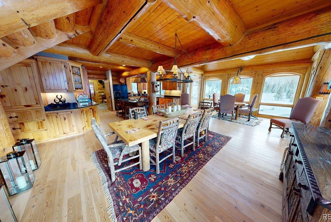 This open-concept space features a warm, rustic design highlighted by extensive natural wood elements, including log beams and a wooden plank ceiling. The dining area centers around a large, natural wood table with eight intricately patterned chairs set on a vibrant, traditional red and blue rug. Adjacent to this is a cozy secondary dining nook by large windows offering sweeping views of the surrounding forest, providing ample natural light. The kitchen cabinetry matches the wood tones, complemented by dark countertops for contrast. A wrought-iron chandelier with lampshades adds vintage charm and soft lighting overhead, emphasizing the cabin’s inviting and earthy aesthetic.