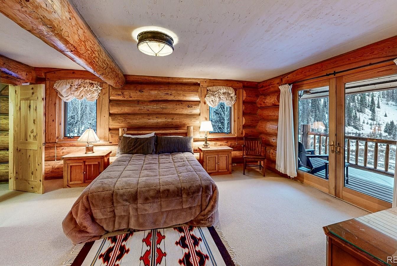 This cozy bedroom features classic log cabin architecture with large, rounded wooden logs composing the walls and ceiling beams, creating a warm and inviting atmosphere. The neutral, soft beige carpet contrasts harmoniously with the rich wood tones, while a plush brown comforter on the bed adds warmth and softness. Complementary wooden nightstands flank the bed, each topped with a lit lamp, providing ambient lighting. Windows with gathered curtains frame the bed, inviting natural light and views of snowy trees. Double sliding glass doors open to a wooden balcony with outdoor seating, extending the room’s connection to the scenic wilderness outside.