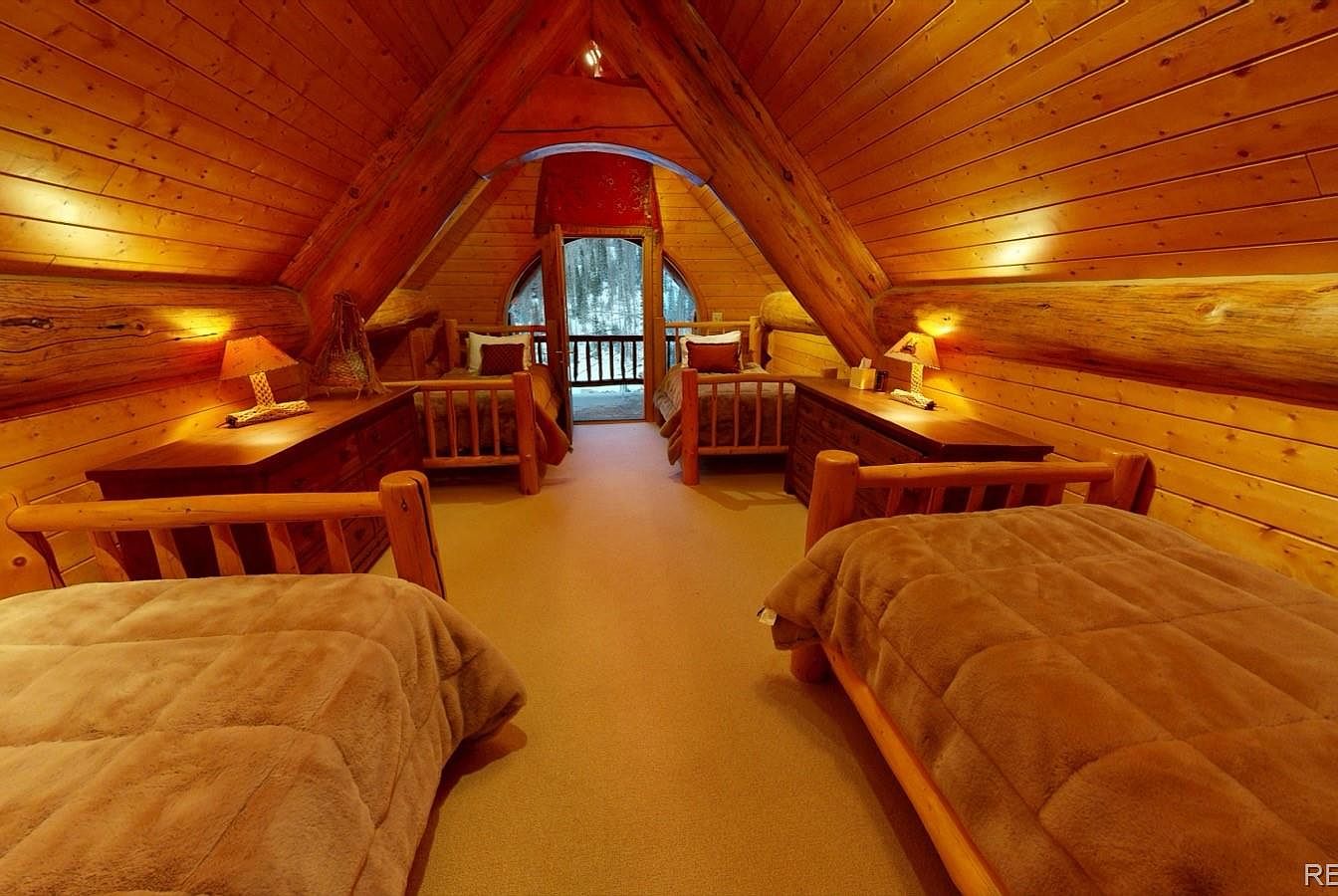 This inviting loft bedroom features a warm rustic style with natural wood paneling covering the walls and ceiling, emphasizing the exposed large, rounded timber beams typical of a log cabin. The space is symmetrically arranged with two twin beds on each side, each dressed in plush, earth-toned blankets that complement the golden hues of the wood. Matching wooden dressers and bedside lamps add symmetry and cozy lighting, while a charming arched window and door at the far end reveal a snowy outdoor view, adding to the cabin’s tranquil, retreat-like atmosphere.