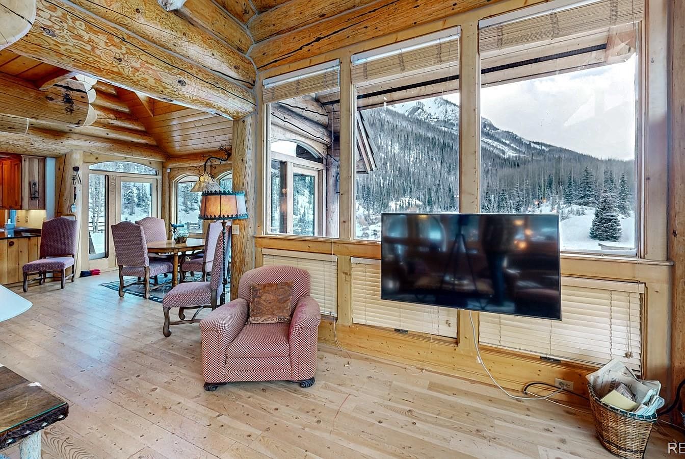 This cozy living room features expansive floor-to-ceiling windows revealing breathtaking snowy mountain vistas, bringing nature’s beauty indoors. The space is grounded with warm, natural wood log beams and paneling, creating a rustic yet inviting cabin ambiance. Plush upholstered chairs and a small dining area with patterned fabric chairs offer comfort and intimate seating. The mounted flat-screen TV provides modern convenience without disrupting the natural aesthetic. Soft, warm lighting and natural wood flooring enhance the welcoming atmosphere, blending traditional rustic elements with contemporary living in a harmonious mountain retreat setting.
