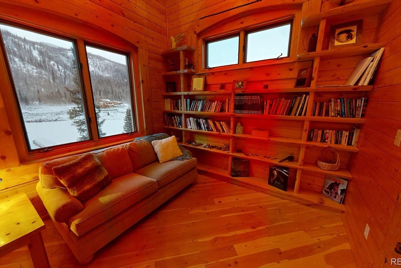 This intimate reading nook features warm wood-paneled walls and flooring that create a rustic, cabin-like atmosphere. A large cushioned sofa occupies one corner, accented with a mix of plush pillows and a cozy throw blanket, inviting relaxation. The built-in wooden shelves wrap around the corner, filled with books, framed pictures, and decorative knick-knacks adding personal charm. Tall windows on two walls offer breathtaking snowy mountain and forest views, flooding the space with natural light that contrasts beautifully with the warm amber tones inside. This corner is perfect for quiet moments immersed in nature and literature.