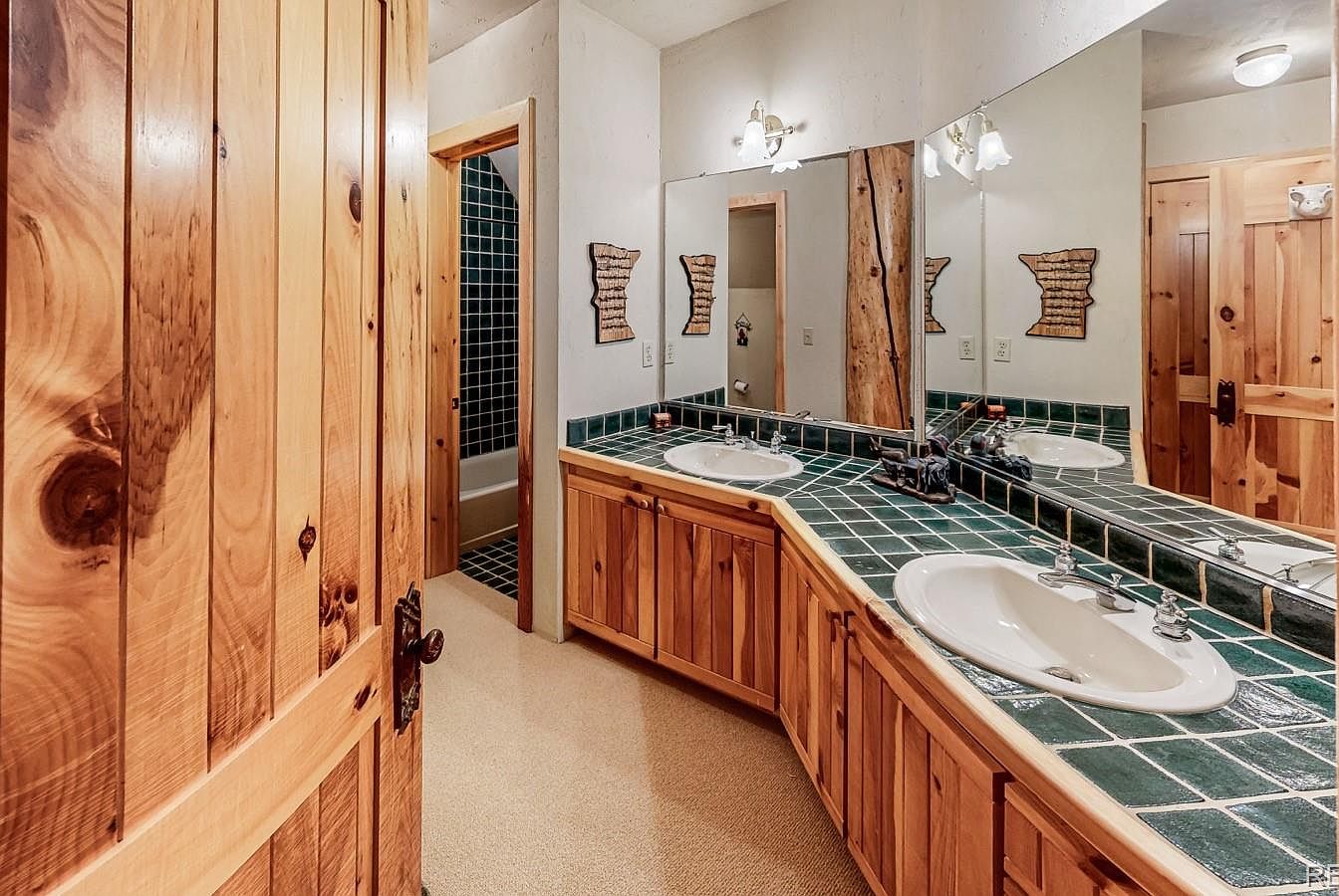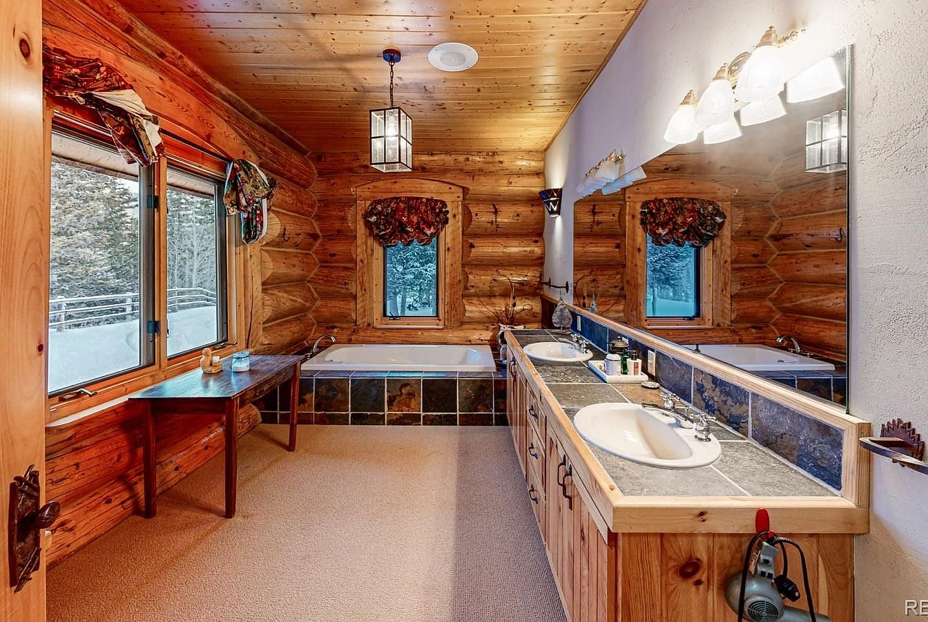 This bathroom exudes cozy rustic charm with its warm log cabin walls and natural wood ceiling. A deep soaking tub is nestled beneath a small framed window adorned with a gathered floral valance, perfect for enjoying snowy outdoor views. The long vanity features dual sinks set within a tiled countertop, echoing earthy tones that complement the wood cabinetry below. Above the sinks, a wide mirror spans the length of the counter, illuminated by traditional wall-mounted sconces. Soft carpet underfoot enhances the warmth and comfort of this inviting retreat, blending nature-inspired aesthetics with practical functionality.