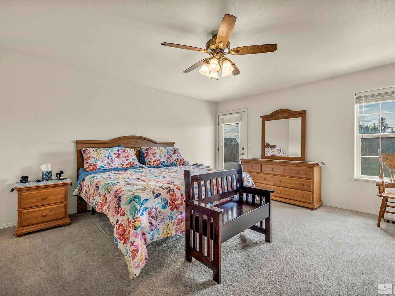 This spacious master bedroom features a calming neutral palette with white walls and beige carpeting that create a serene atmosphere. A wooden bed with an intricately carved headboard anchors the room, adorned with vibrant floral bedding that introduces bursts of color and liveliness. On one side, a matching wooden nightstand holds essentials, while across the room, a large dresser with a framed mirror provides ample storage and complements the wood tones. A small wooden bench at the foot of the bed adds both function and rustic charm. Natural light pours in through a window and a glass door leading outside, enhancing the bright, airy feel complemented by a ceiling fan with light fixtures overhead.