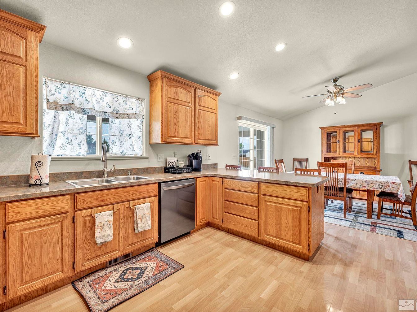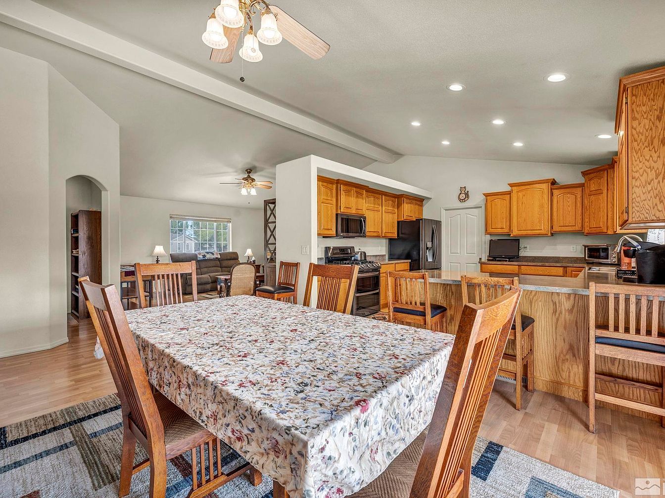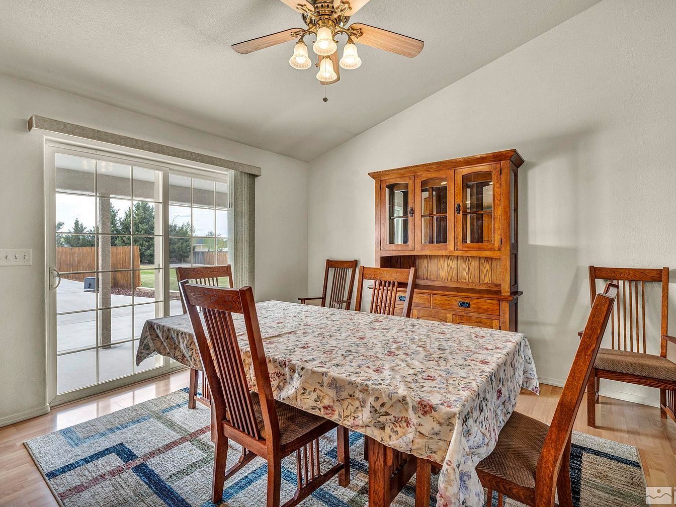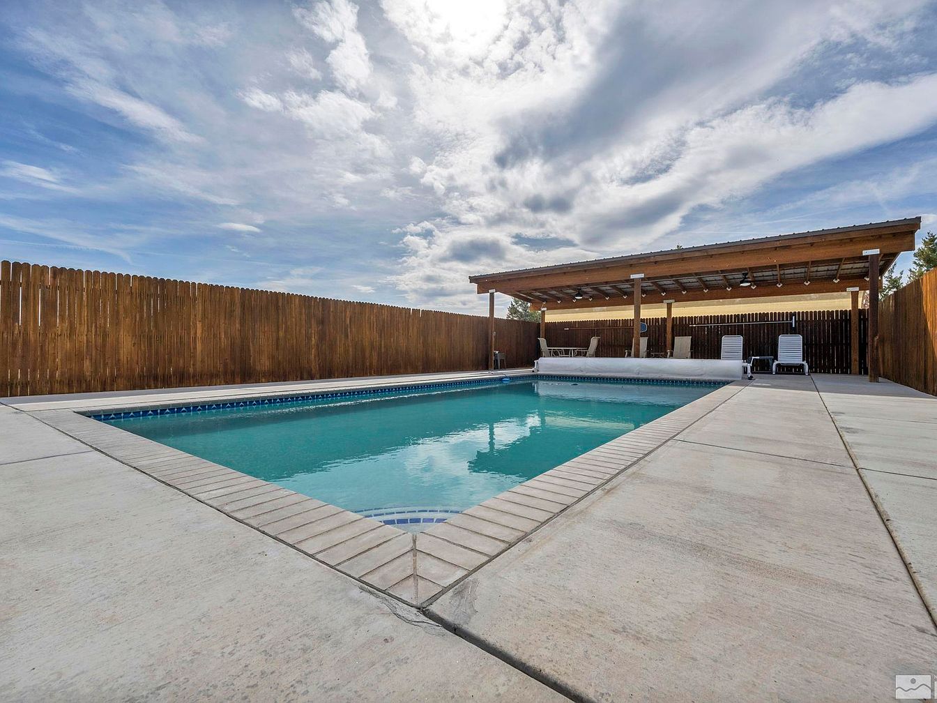 This modern farmhouse, located in one of the most desirable neighborhoods of Fallon, Nevada, is a true desert oasis sitting on a fully landscaped one-acre plot. The home features a spacious front yard with a large concrete driveway leading to a two-car garage, highlighting its generous outdoor space that includes large RV access. Inside, the property is well maintained, boasting tall vaulted ceilings and laminate wood flooring that add to the open and airy ambiance. The kitchen is equipped with stainless steel appliances, and a newer A/C unit ensures comfort during the hot summer months. While the year the home was built is not specified, recent upgrades such as the newer air conditioning system suggest attentive upkeep. The backyard serves as the “crown jewel” of this residence, designed with a resort-style patio, an in-ground heated pool usable year-round, and a covered pool patio that rivals those of luxury resorts. The lush backyard is complemented by grass and mature trees, perfect for entertainment and relaxation. The listing price for this stunning property is $630,000.