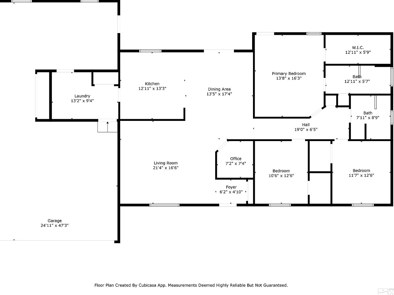 This floor plan highlights a spacious single-level home with a well-organized layout designed for comfort and functionality. The living room, generously sized at 21’4″ x 16’6″, sits adjacent to an open dining area and kitchen, creating a cohesive space for entertaining and daily living. Three bedrooms, including a primary bedroom with an attached walk-in closet and bath, offer ample privacy. Additional rooms include a cozy office near the foyer and a generous laundry room connected to the large garage. Hallways provide smooth circulation, balancing openness with distinct zones for living and resting.
