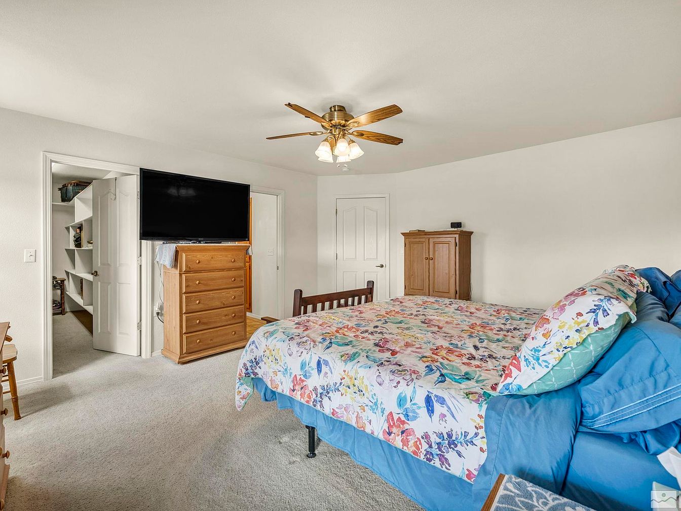 The master bedroom features a spacious layout with soft neutral-toned walls and light carpeting, creating a calm and inviting atmosphere. A wooden bed frame supports a colorful floral-patterned comforter paired with coordinating pillows in shades of blue and multicolor, adding a playful yet cozy touch. Two wooden dressers provide ample storage, with a large flat-screen TV positioned on one for convenient viewing from the bed. Ceiling lighting includes a traditional wooden-blade fan with multiple light fixtures, enhancing both comfort and functionality. The room opens to a walk-in closet and adjacent bathroom for ease of access.