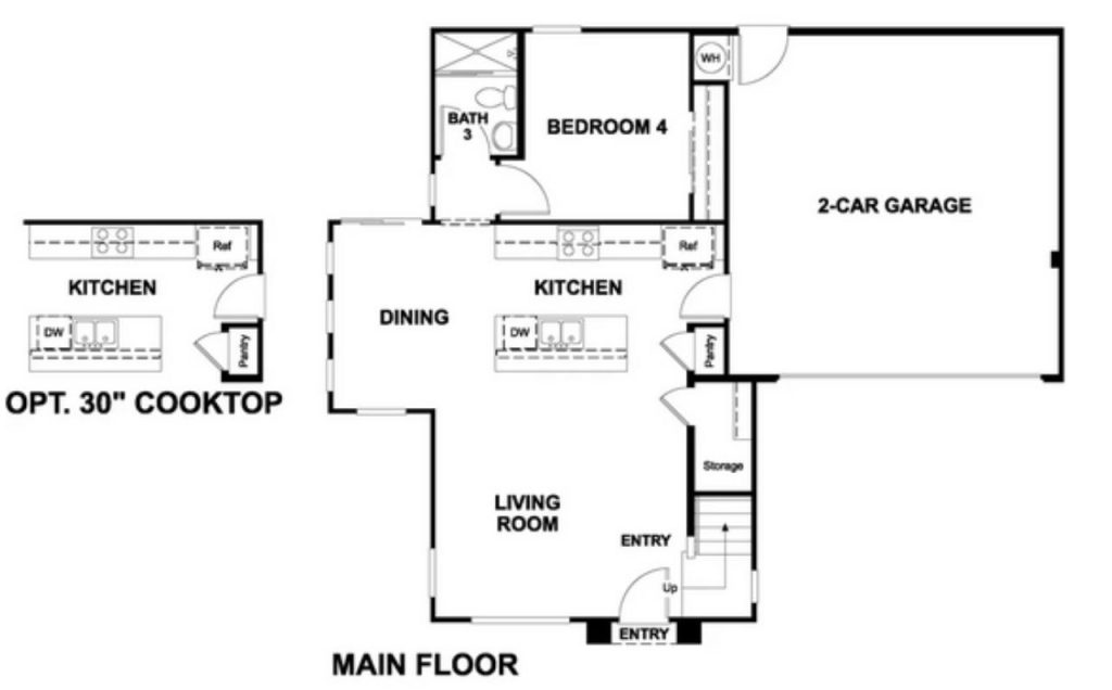 This main floor layout combines convenience and functionality, offering a spacious living room that seamlessly flows into the dining area and kitchen, ideal for both daily living and entertaining. The well-designed kitchen features ample counter space and modern appliances, with an optional 30″ cooktop for added flexibility. A nearby bedroom, perfect for guests or a home office, is conveniently located next to a full bath. The two-car garage provides easy access, with stairs leading to additional levels. This layout is ideal for families seeking practicality without sacrificing style.