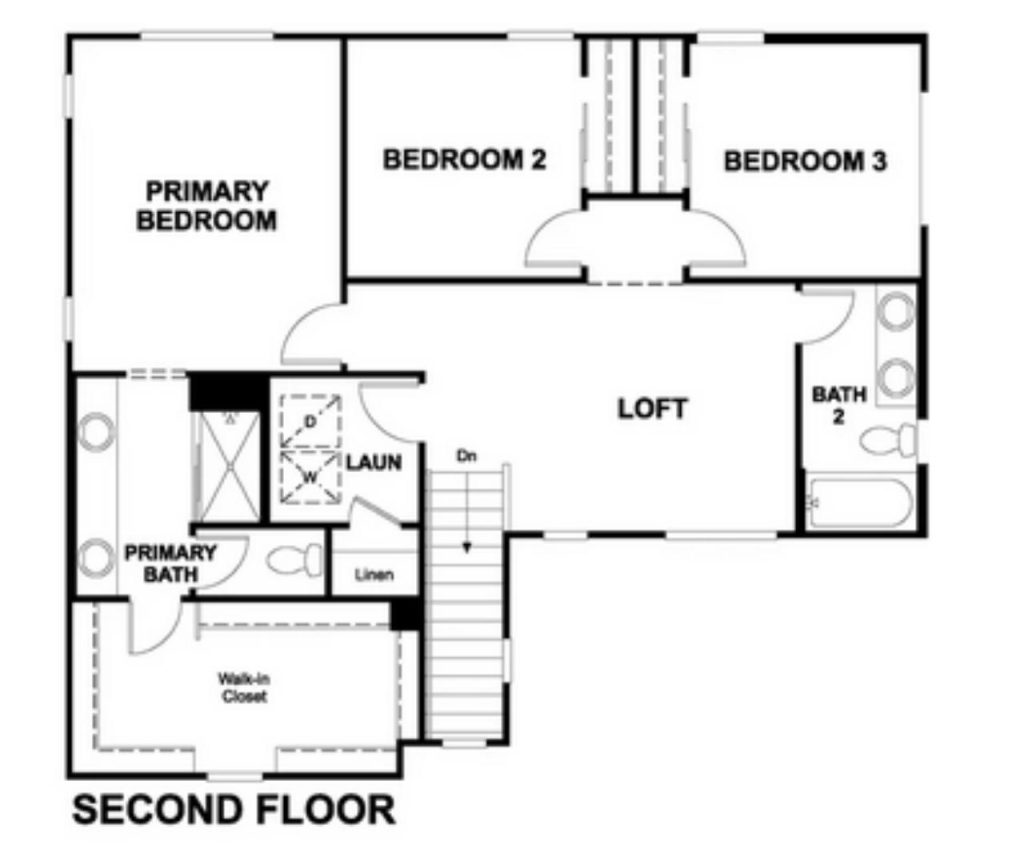 The second floor provides a comfortable and private retreat with three generously sized bedrooms, including the primary bedroom, which features a spacious walk-in closet and an ensuite bath. A convenient laundry room is located near the bedrooms, adding to the home’s practicality. The loft space offers a versatile area for relaxation or recreation, while a second full bathroom serves the other two bedrooms. This floorplan is perfect for families seeking a well-organized and functional space that still feels open and inviting.