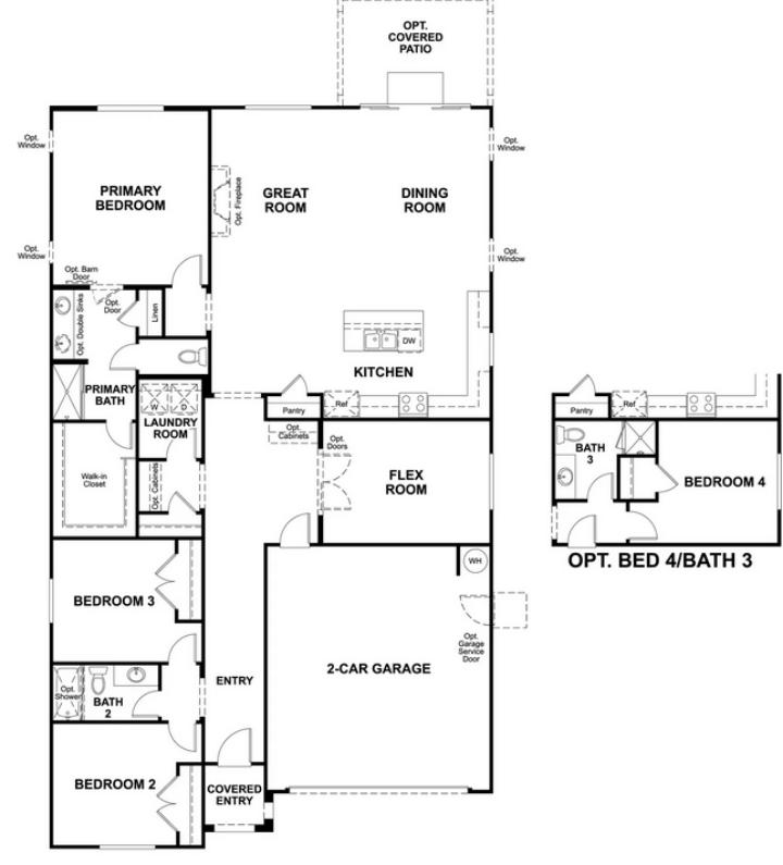 This spacious and well-designed main floor features a primary bedroom suite with a private bath and walk-in closet, offering a peaceful retreat. Two additional bedrooms, each with easy access to a full bath, provide ample space for family or guests. The open-concept living areas include a great room and dining room, creating a bright and airy space for relaxation and entertaining. The kitchen, with its central pantry, flows seamlessly into a flex room that can be adapted to meet various needs. The laundry room is conveniently located nearby, and the 2-car garage offers easy access to the home.