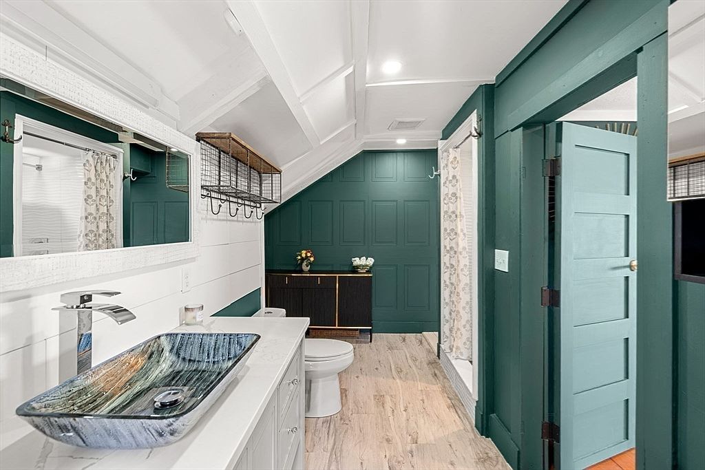 This bathroom exudes a refined charm with rich green paneled walls providing a striking contrast to the bright white shiplap ceiling and upper walls. The space is elongated with wood-look plank flooring that adds warmth and texture. A distinctive rectangular glass vessel sink with a marbled blue pattern sits atop a white vanity, paired with a modern chrome faucet. To the left, a large white framed mirror expands the sense of space. The shower area is enclosed with a floral-patterned curtain. Black metal grid shelving and a dark cabinet add functional accents while maintaining a cohesive modern-rustic aesthetic.