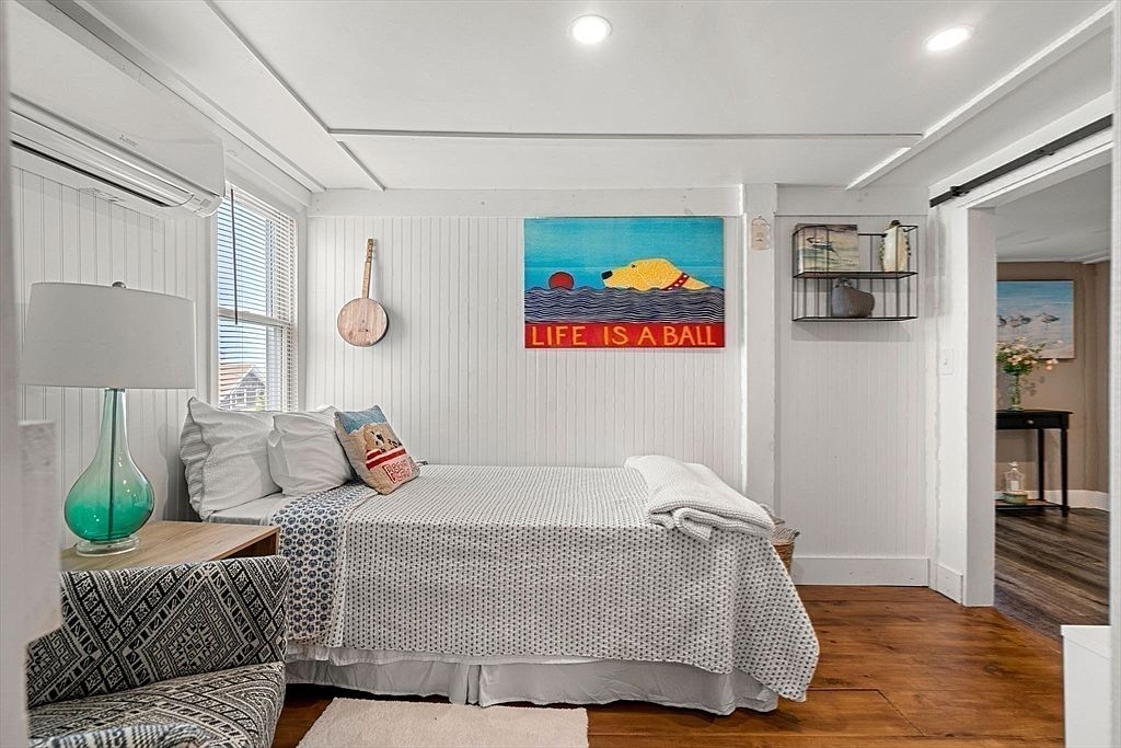 This intimate bedroom corner features a calming white paneled wall contrasted by warm wood flooring that adds natural texture and richness. A full bed with white and patterned bedding invites comfort, accented by a charming pillow and a neat folded blanket at the foot. Soft recessed lighting brightens the space without overwhelming it. Decorative elements include a vibrant, playful wall art above the bed reading “LIFE IS A BALL,” and a rustic wooden stringed instrument hanging nearby, adding character. Furnishings include a teal glass lamp on a simple wooden nightstand and a patterned armchair, creating a cozy, eclectic vibe. A small wire shelving unit holds books and decor, with an open doorway giving a glimpse into an adjacent, warmly decorated room.