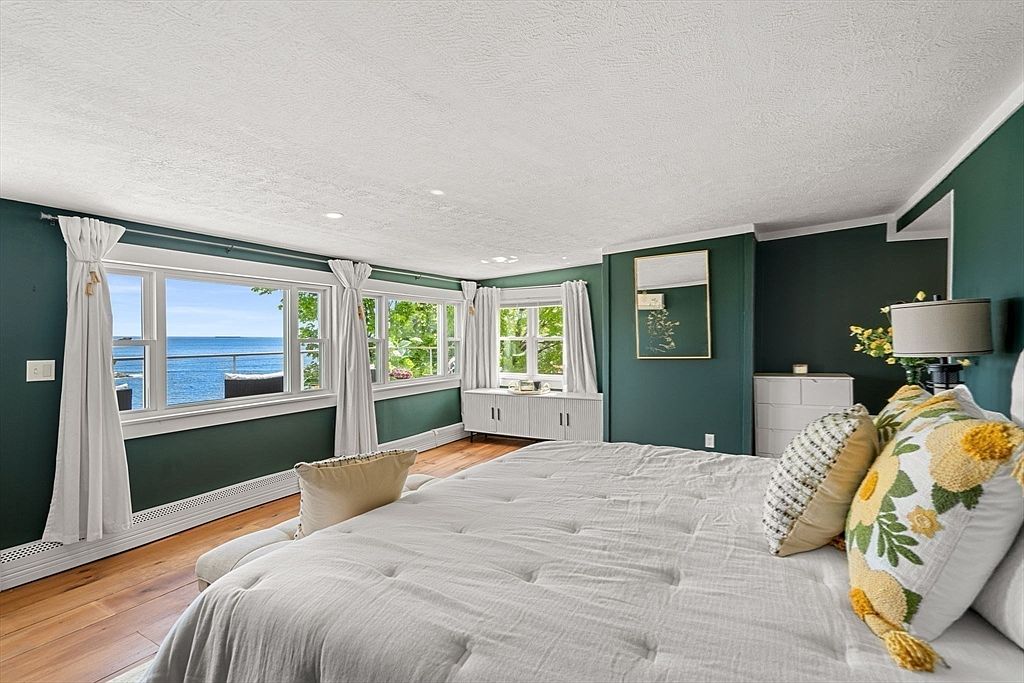 This spacious bedroom features deep green walls contrasted by bright white trim and ceiling, creating a fresh and calming ambiance. Large windows span two walls, flooding the room with natural light and offering stunning views of the water outside. White curtains soften the window frames while allowing for privacy. The bed is dressed in neutral linens accented by pillows with floral and patterned designs in yellow, green, and beige tones, complementing the wall color. Hardwood floors add warmth to the space. Minimalist furnishings, including a sleek white dresser and a mirror, complete the serene design.