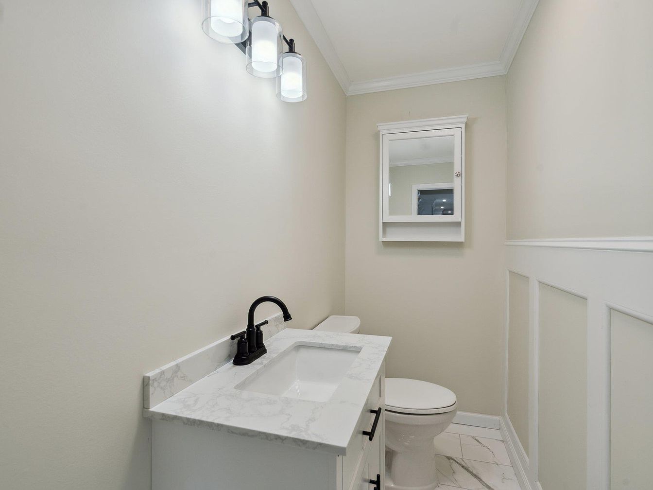 This bathroom features a clean and minimalistic design with soft, neutral tones that create a calming atmosphere. A white vanity with a marble-like countertop sits below a modern black faucet, complementing the black hardware on the cabinetry. The floor is tiled with white marble-patterned tiles that add subtle elegance. Above the vanity, a wall-mounted mirror cabinet provides practical storage, framed with simple trim matching the crown molding and lower half wall paneling, which adds architectural interest and texture. Three contemporary glass light fixtures hang above, providing ample illumination to the compact, well-organized space.