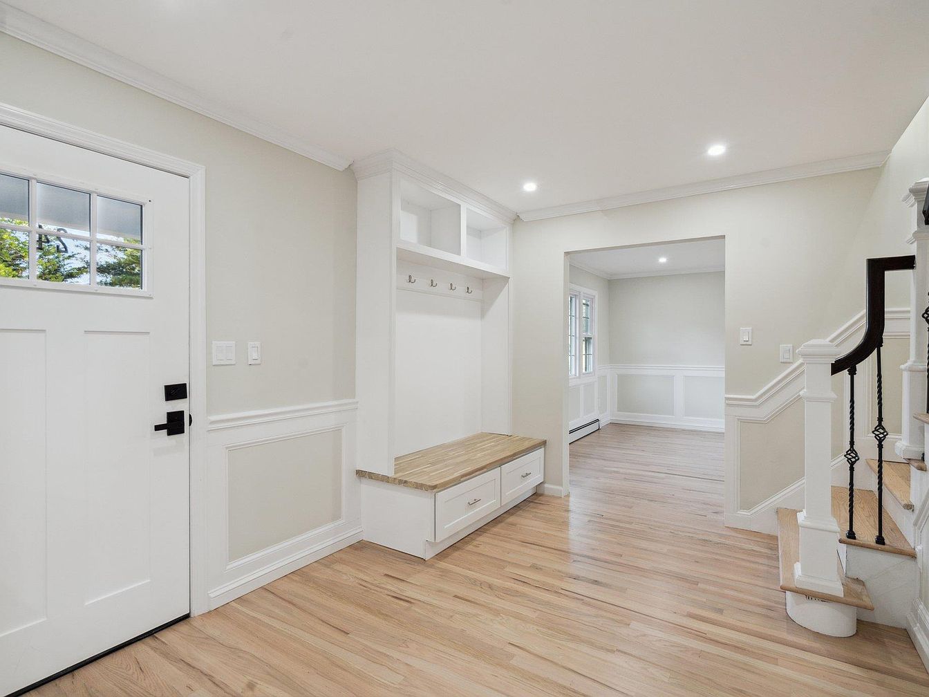 This bright and inviting entryway combines functionality with clean design. The white front door with a small window panel allows natural light to filter in, complementing the soft beige walls and white wainscoting that add subtle texture. A practical built-in bench with a natural wood seat top provides a convenient spot for putting on shoes, while the upper shelves and hooks offer organized storage for coats and bags. Light wood flooring continues throughout, connecting seamlessly to an adjacent room with classic white trim molding. A staircase with white newel posts and wrought iron balusters brings elegance and contrast to the space.