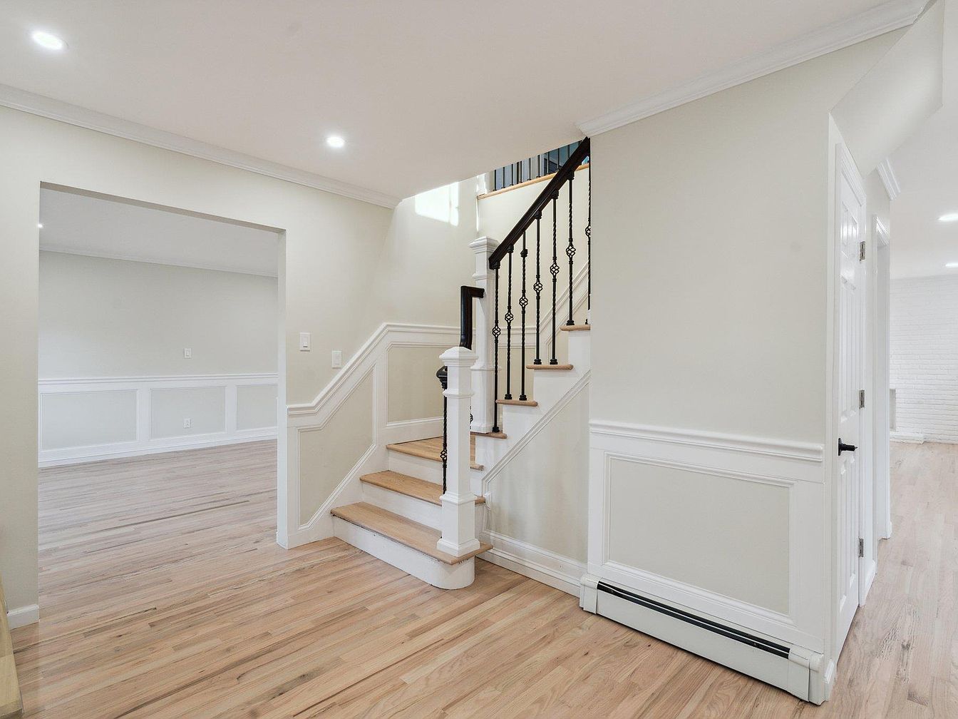 This entryway showcases a clean and inviting passage into the home. Light hardwood flooring continues throughout, connecting to an adjacent room visible through a large open doorway. The walls are painted a subtle off-white, complemented by crisp white wainscoting and baseboards that add architectural interest. The staircase, positioned prominently, features natural wood steps paired with a white riser and base. Black wrought iron balusters with decorative twists create a striking contrast against the light backdrop, while a dark wood handrail adds warmth. Recessed ceiling lights brighten the space, enhancing its timeless, elegant aesthetic.
