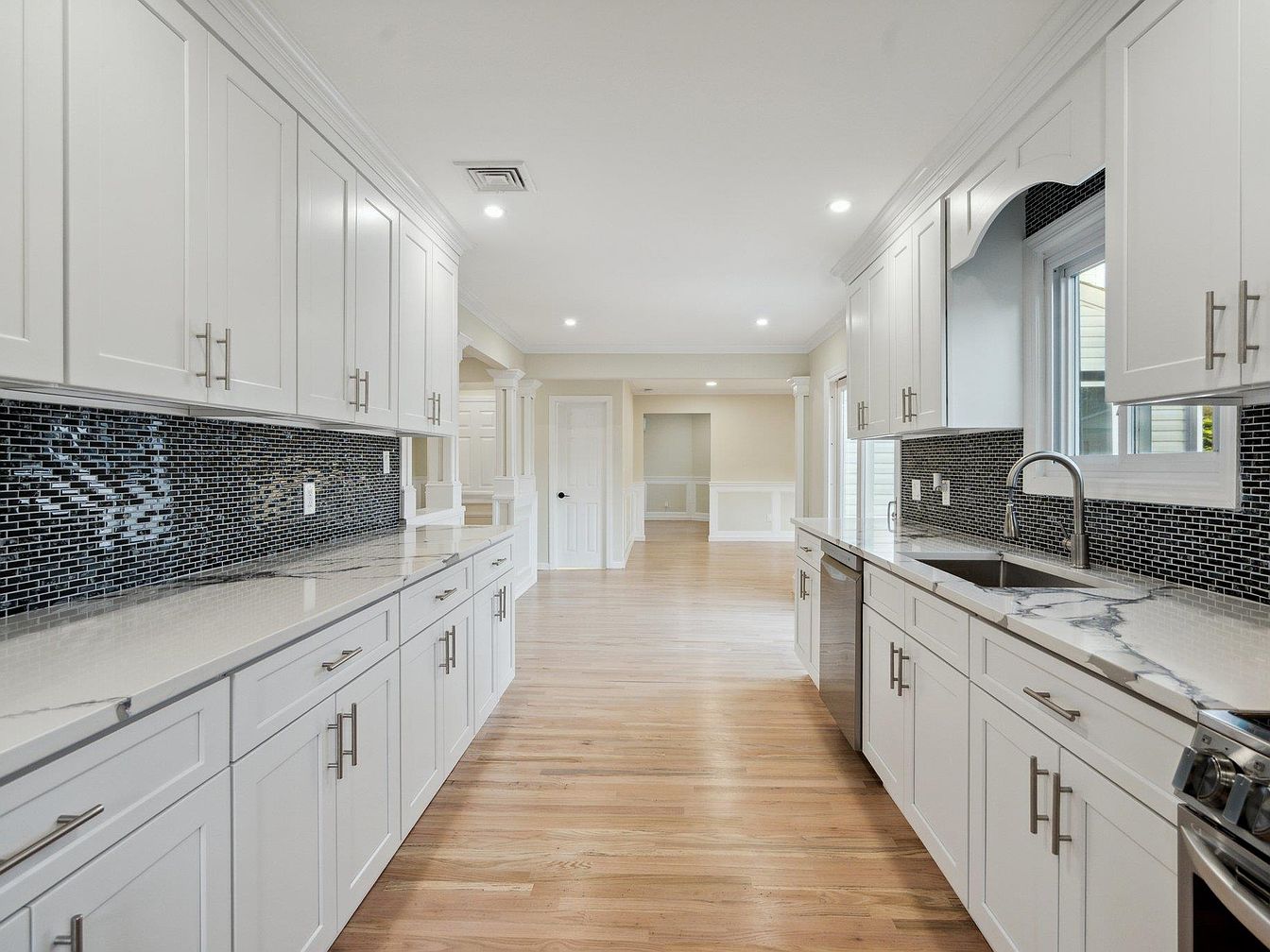 This kitchen features a sleek galley layout with parallel countertops and cabinetry on both sides, maximizing workspace and storage. Bright white shaker-style cabinets with brushed nickel handles contrast elegantly against a black mosaic tile backsplash, adding texture and depth to the space. The countertops exhibit a pristine marble pattern that complements the modern stainless-steel sink and built-in dishwasher. Natural light filters in through a window above the sink, enhancing the room’s airy and open feel. The soft wood flooring extends into the adjoining areas, creating warmth while maintaining a contemporary and clean aesthetic throughout.