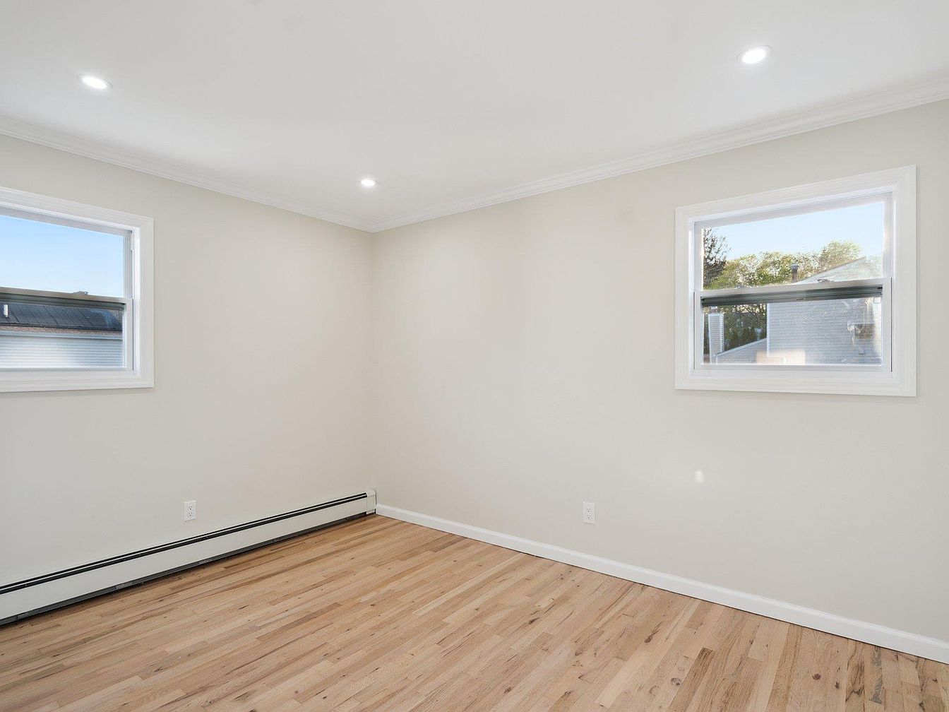 This bedroom features a minimalist and clean design with neutral cream-colored walls and white trim framing two medium-sized windows that bring in natural light. The hardwood floor displays a warm, natural wood tone with subtle grain patterns, enhancing the room’s inviting ambiance. The ceiling has recessed lighting fixtures that provide ample illumination while maintaining the space’s simplicity. Baseboard heating lines the perimeter of the room, adding a functional detail. The overall aesthetic is modern yet cozy, offering a blank canvas ready for personal furnishings and decor to create a comfortable sleeping retreat.
