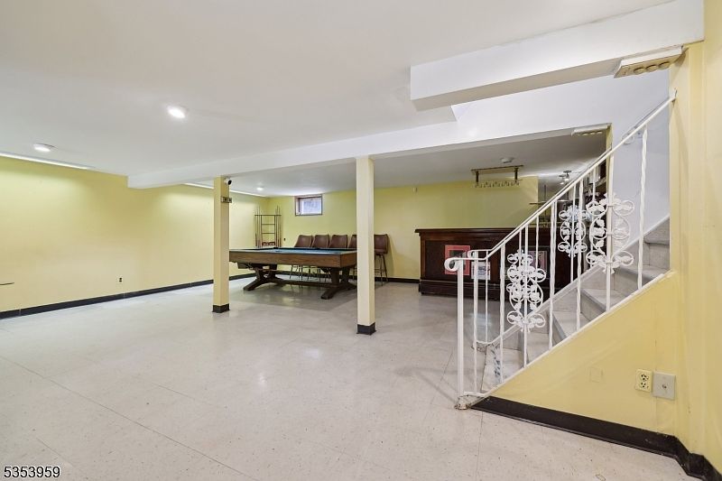 This spacious basement features a pale yellow paint scheme that adds warmth to the expansive area, complemented by simple white ceiling panels and recessed lighting. The floor is a light-toned, durable surface suitable for high activity. Structural columns subtly divide the room while maintaining openness. A staircase with a decorative wrought-iron railing leads downward, adding an element of classic charm. Furnished with a pool table and leather chairs in the back, the space is designed for entertainment and relaxation, with a bar area featuring a dark wood counter, perfect for social gatherings.