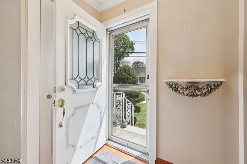This charming entryway features a classic white front door with intricate stained glass panels that add elegance and allow natural light to filter through. Adjacent to the door, a full-length glass storm door provides a clear view of the front steps, framed by delicate wrought iron railings. The walls are painted in a soft beige tone, creating a warm and inviting atmosphere. An ornamental half-wall shelf with elaborate scroll detailing adds a decorative touch, hinting at the home’s vintage character. Natural wood flooring at the threshold contrasts gently with the light walls, completing this welcoming foyer space.