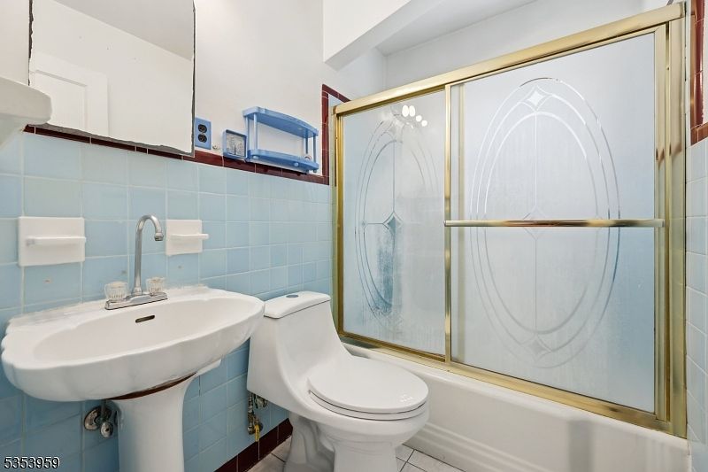 This compact bathroom blends mid-century design with functional simplicity. The space features light blue ceramic tiles covering half the walls, bordered by contrasting dark red trim for a subtle pop of color. A classic pedestal sink sits adjacent to a modern one-piece toilet, emphasizing clean lines and efficient use of space. The tub is enclosed by a sliding glass door with a distinctive etched oval pattern framed in brass, adding a touch of retro elegance. White tile flooring complements the light tones, while the small mirrored medicine cabinet and a simple soap holder contribute to the understated, practical aesthetic.