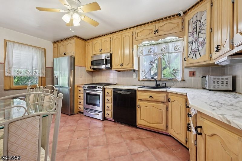 This spacious kitchen features a warm, inviting atmosphere with honey-toned wooden cabinetry that lines the walls, offering ample storage. The counters are finished with a light, marble-like surface contrasted by black hardware and a black undermount sink, tying in with the black dishwasher. Stainless steel appliances, including a modern fridge and oven, add a sleek touch to the space. The terracotta floor tiles provide earthy warmth and complement the natural wood tones. A window with floral-trimmed curtains above the sink allows natural light to brighten the area. Adjacent, a glass-top dining table with wrought iron chairs creates a charming breakfast nook. The white ceiling fan overhead helps maintain comfort in this practical yet cozy kitchen.