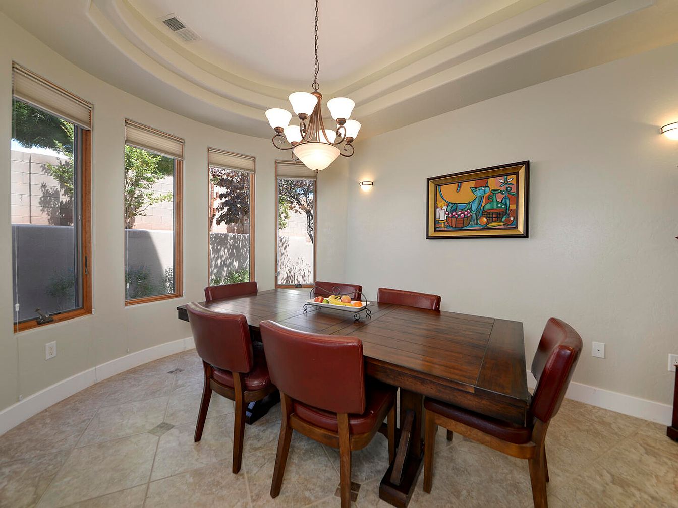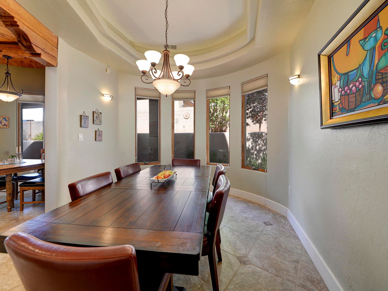 This dining room features a spacious, rectangular wooden table with a rich, dark finish that serves as the room’s centerpiece, surrounded by six upholstered chairs in a deep reddish-brown leather. The flooring consists of large beige tiles with subtle patterns, contributing to the warm, neutral color palette. Four tall, narrow windows with wooden frames allow ample natural light, accentuated by soft beige walls. A classic chandelier with multiple white glass shades hangs from the coffered ceiling, adding an elegant touch. Minimalist wall sconces and a vibrant framed artwork complete the inviting and refined ambiance.