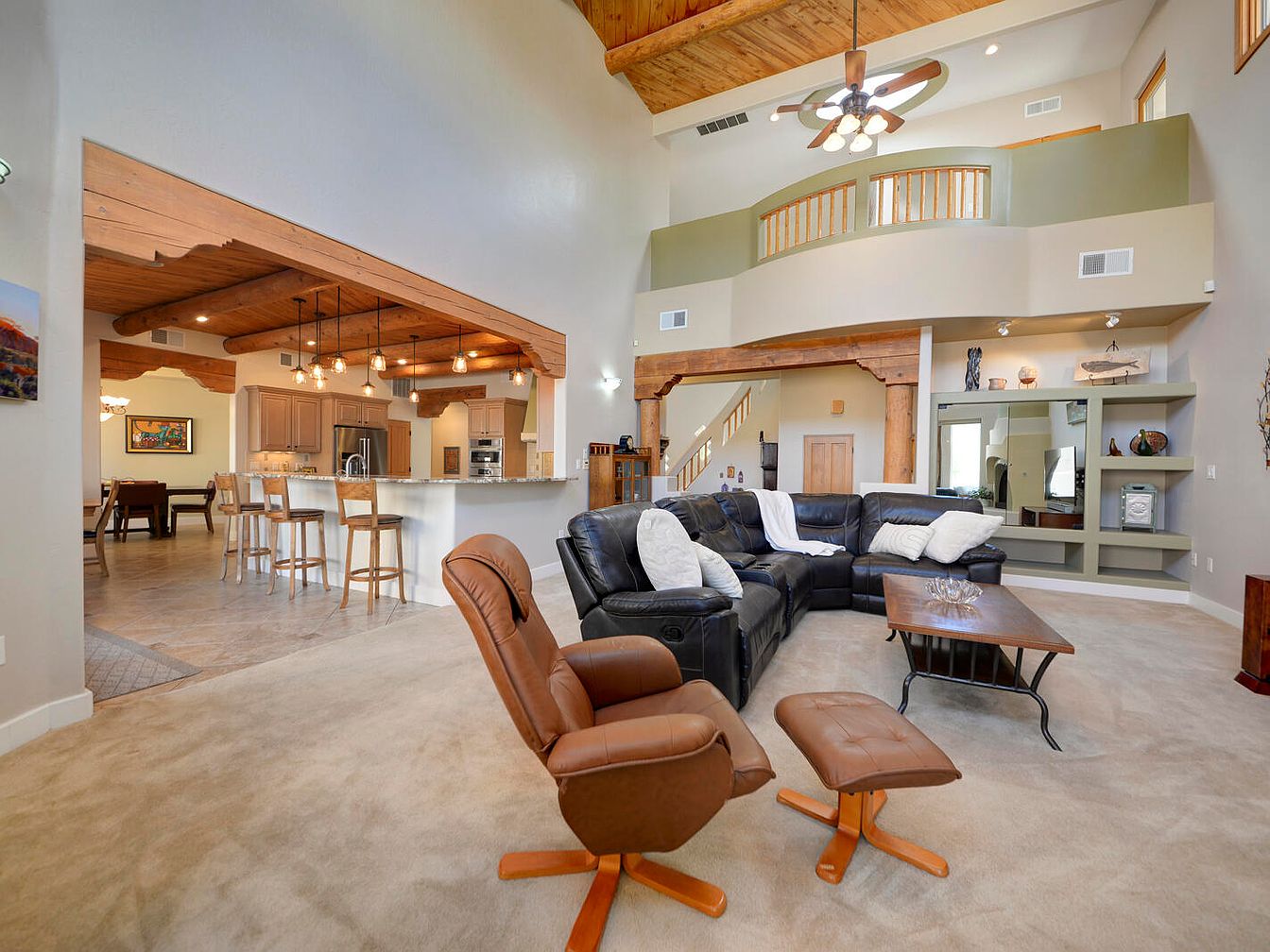 This spacious open-concept living area features a blend of rustic and contemporary styles. The high vaulted ceiling is clad in warm wood planks, complemented by exposed wooden beams and trim, which frame the entrance to the kitchen and stairway. A ceiling fan with multiple light fixtures hangs prominently, adding both function and charm. The living room furniture includes a large black leather sectional accented with light cushions and a matching brown leather recliner with an ottoman. The beige carpet softens the room, contrasting with the polished tile surrounding the kitchen. The kitchen itself boasts a granite countertop bar with wooden bar stools, pendant lighting, and muted cabinetry, blending seamlessly with the overall earth-tone palette. An elevated loft area with a rounded railing adds architectural interest and extra living space. Built-in shelving and mirrored panels adorn one wall, providing both storage and a decorative focal point.