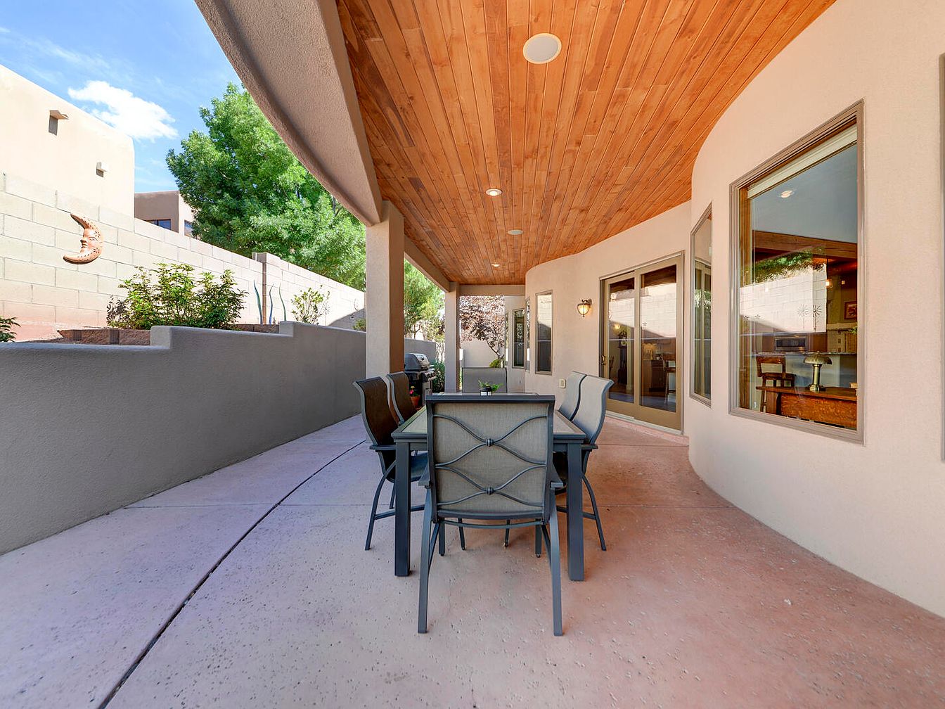 This outdoor covered patio features a long and curved layout with a warm wooden ceiling that adds natural texture and richness. The floor is a smooth, pinkish concrete complementing the light beige stucco walls, producing a soft and calming atmosphere. A black metal dining table with six mesh-backed chairs offers a comfortable space for outdoor meals or gatherings. Large windows and sliding glass doors line the home’s exterior wall, allowing light and easy access between indoor and outdoor spaces. The surrounding low retaining wall encloses a small garden area with greenery, creating a private and serene retreat for relaxation and entertaining.