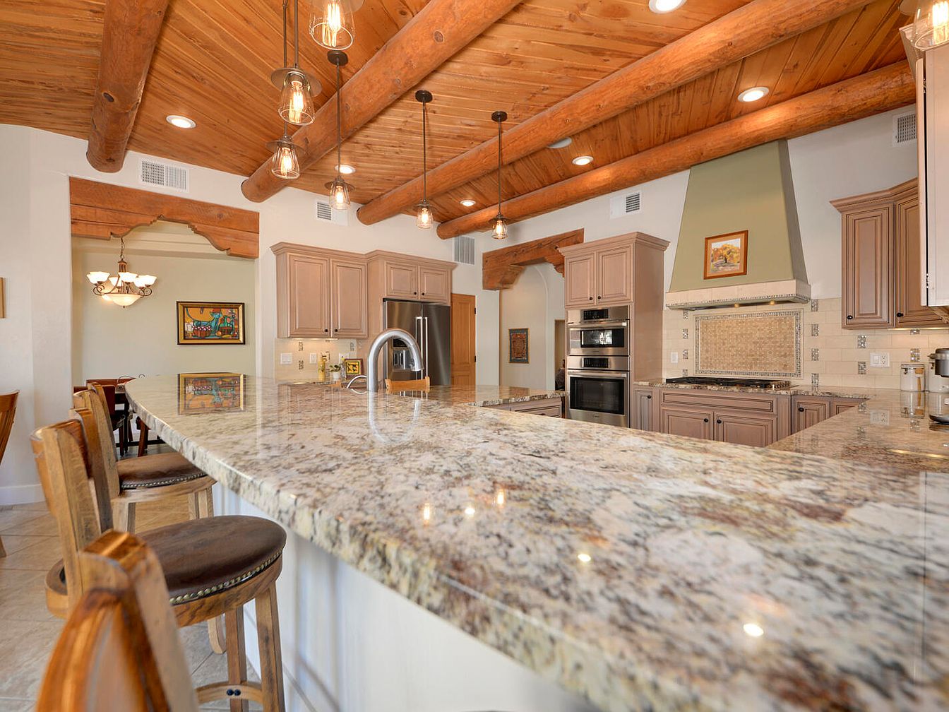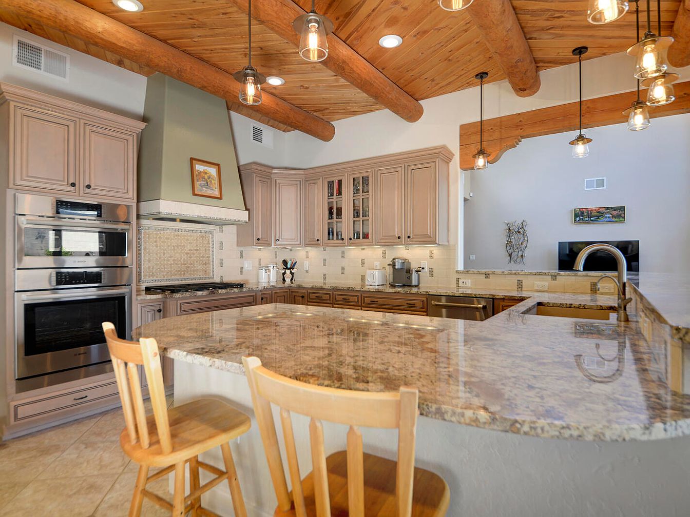 This kitchen boasts a spacious granite countertop island with a polished finish, centered between natural wood log beams on the ceiling for a rustic touch. The light brown, raised-panel cabinets complement the earthy color palette, extending around the kitchen with built-in stainless steel appliances. The pendant lights with exposed bulbs hang above the island, enhancing warmth and inviting ambiance. A sage green vent hood adds a subtle pop of color above the stove, surrounded by beige tile backsplash featuring mosaic accents. Wooden bar stools with cushioned seats provide casual seating at the island, blending comfort with natural textures.