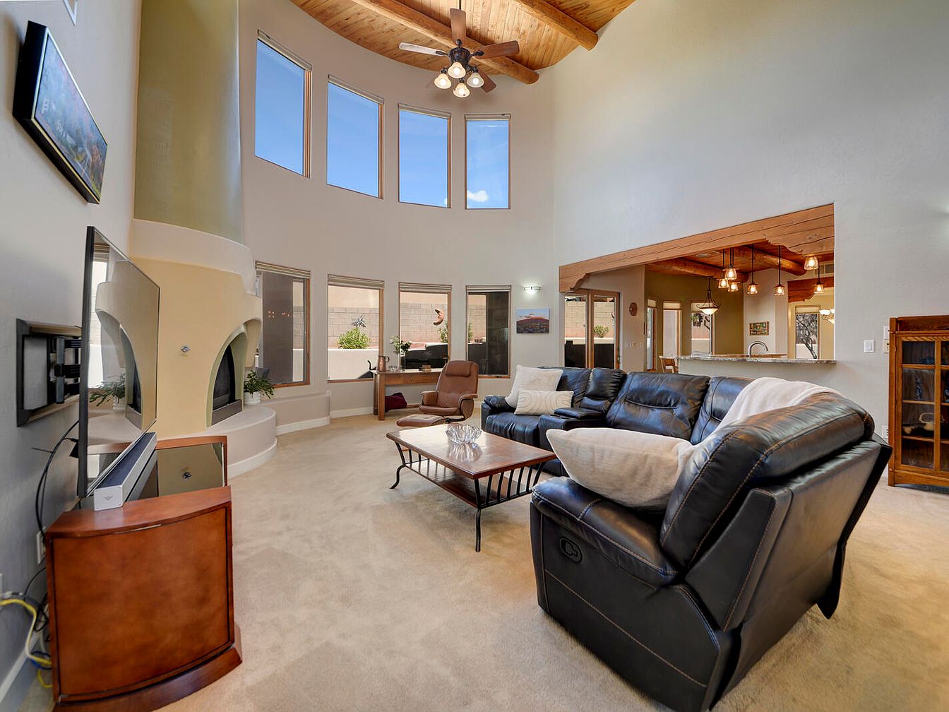 This living room features a high, curved ceiling with wood paneling and exposed beams, creating a warm and inviting atmosphere. Large, vertically elongated windows provide abundant natural light, enhancing the airy feel of the space. The curved adobe-style fireplace anchors the room with southwestern charm. A black leather sectional and matching chair provide comfortable seating focused on a flat-screen TV mounted on the wall. Neutral beige carpeting complements the off-white walls. The open design extends to the kitchen area, unified by wood accents and a granite countertop breakfast bar with hanging pendant lights, blending rustic and modern aesthetics.