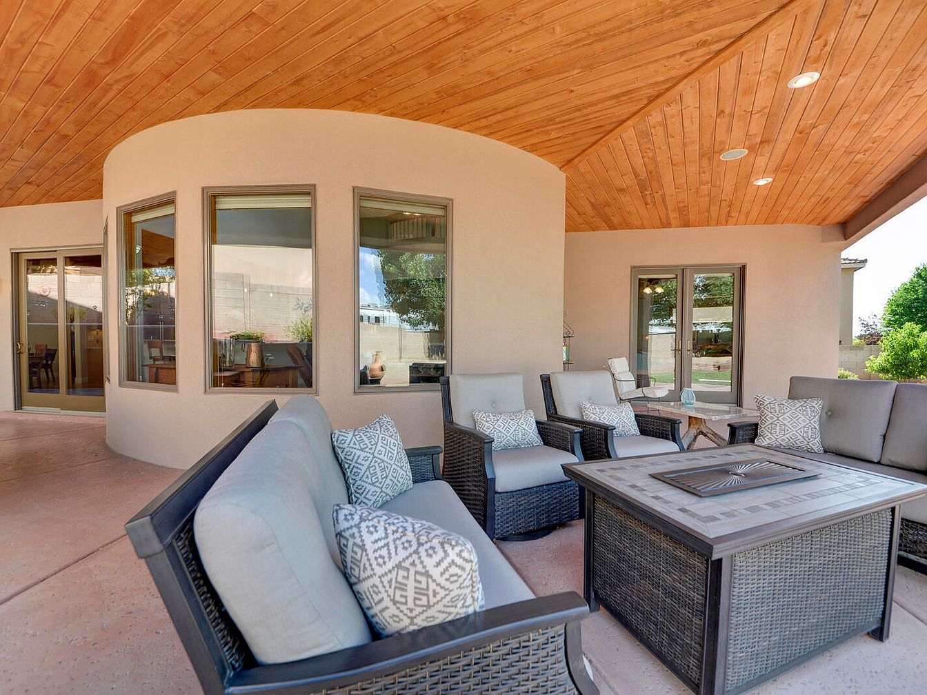 This spacious covered patio features a warm wooden plank ceiling that adds natural texture and a cozy feel. The area is furnished with matching woven rattan-style chairs and sofas upholstered in soft light gray cushions, complementing the neutral beige stucco walls. Patterned gray and white throw pillows add a subtle decorative accent. Central to the seating grouping is a large square firepit table with a tiled top, creating a focal point for conversation and relaxation. Multiple large windows and French doors connect the outdoor space to the interior, enhancing the open, airy design and inviting natural light inside.