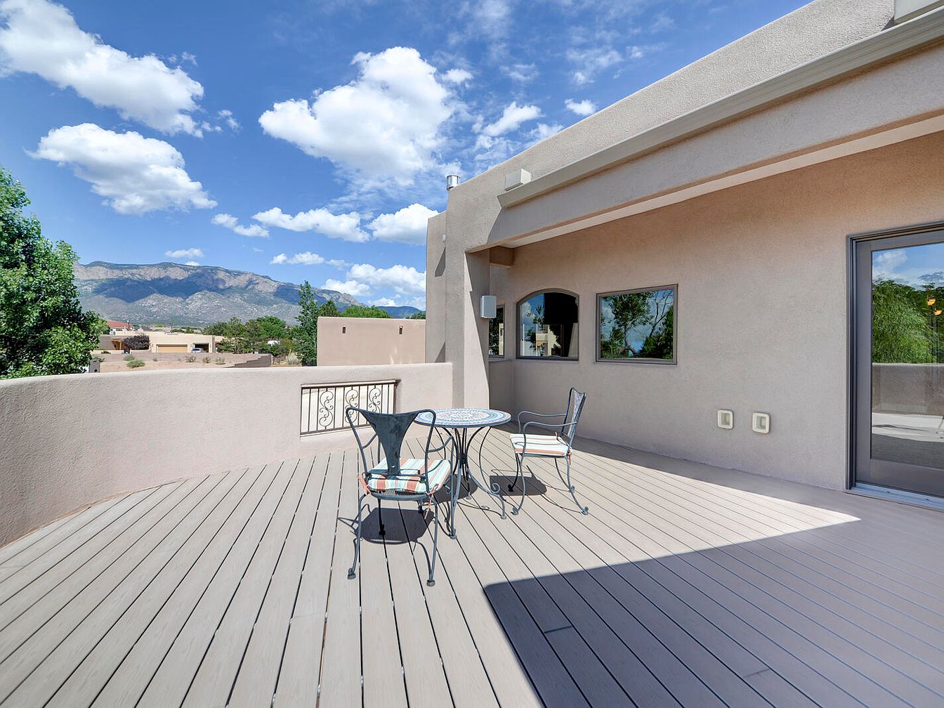 This spacious outdoor balcony features a smooth, taupe-toned wooden deck floor that extends generously in front of stucco walls painted in a soft beige. The seating area consists of a charming wrought iron table with an intricate patterned top and two matching chairs, each equipped with cushioned seats in muted pastel stripes, perfectly blending comfort and style. Two rectangular windows and a glass door provide a subtle modern touch to the structure, reflecting the lush surrounding greenery. Beyond the balcony, scenic mountain views stretch under a bright blue sky dotted with fluffy white clouds, creating a serene atmosphere for relaxation or casual dining.