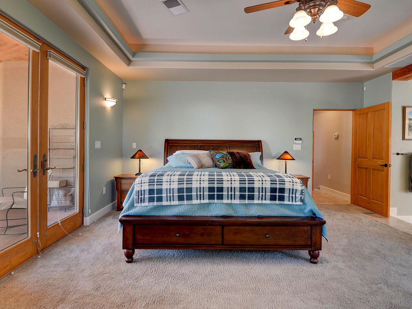 This spacious master bedroom features a calming color palette with light blue walls complemented by warm natural wood tones in the bed frame, nightstands, and door trim. The elegant wooden bed with a classic sleigh design is dressed in soft blue bedding layered with a plaid throw and decorative pillows. Plush carpet flooring adds comfort and warmth underfoot. Architectural details include a tray ceiling with crown molding and a ceiling fan with frosted glass light fixtures. Large double French doors open to a cozy outdoor space, inviting natural light into the relaxing retreat.