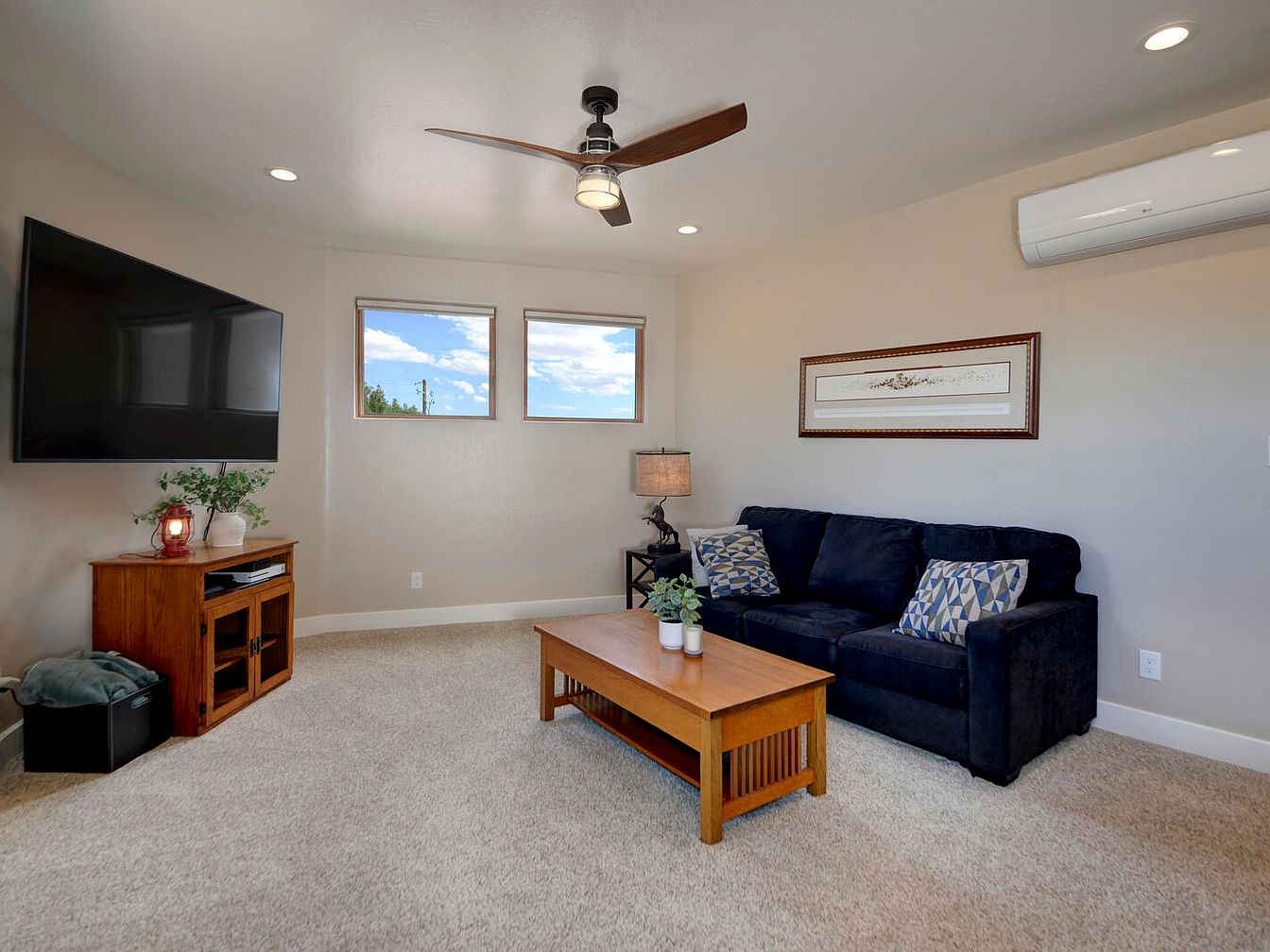 This comfortable living room features a neutral color palette with beige walls and carpet, creating a warm and inviting atmosphere. A dark blue sofa adorned with geometric-patterned pillows anchors the seating area, complemented by a wooden coffee table with simple lines and lower shelf space. A small side table with a sculptural lamp adds an artistic touch beside the sofa. Opposite, a wall-mounted flat-screen TV is positioned above a wooden cabinet that houses electronic devices and decoration. Two windows provide natural light, while a modern ceiling fan with wooden blades and recessed lighting ensure a well-lit, airy space ideal for relaxation.
