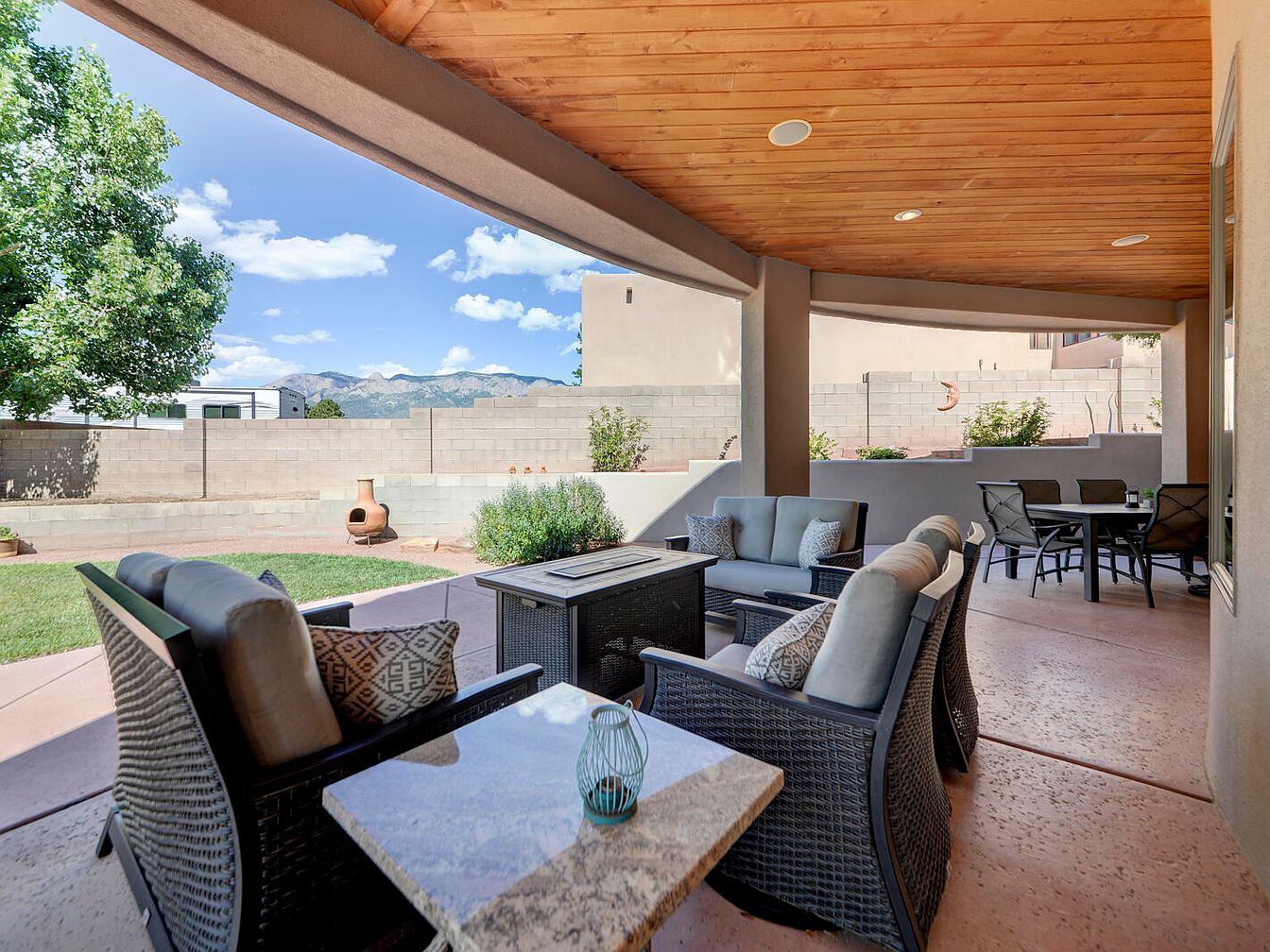 This spacious covered patio blends comfort and style with a natural wooden ceiling that adds warmth and texture overhead. The seating arrangement includes cushioned wicker armchairs and a matching loveseat centered around a fire pit table, perfect for evening gatherings. Adjacent to this is a dining table with chairs, offering ample space for outdoor meals. The color palette features neutral earth tones, from soft beige cushions to dark wicker frames, complementing the muted concrete patio floor. Beyond, a low stone wall borders the yard with scattered greenery and a terracotta chiminea, all set against a serene view of distant mountains under a bright blue sky.