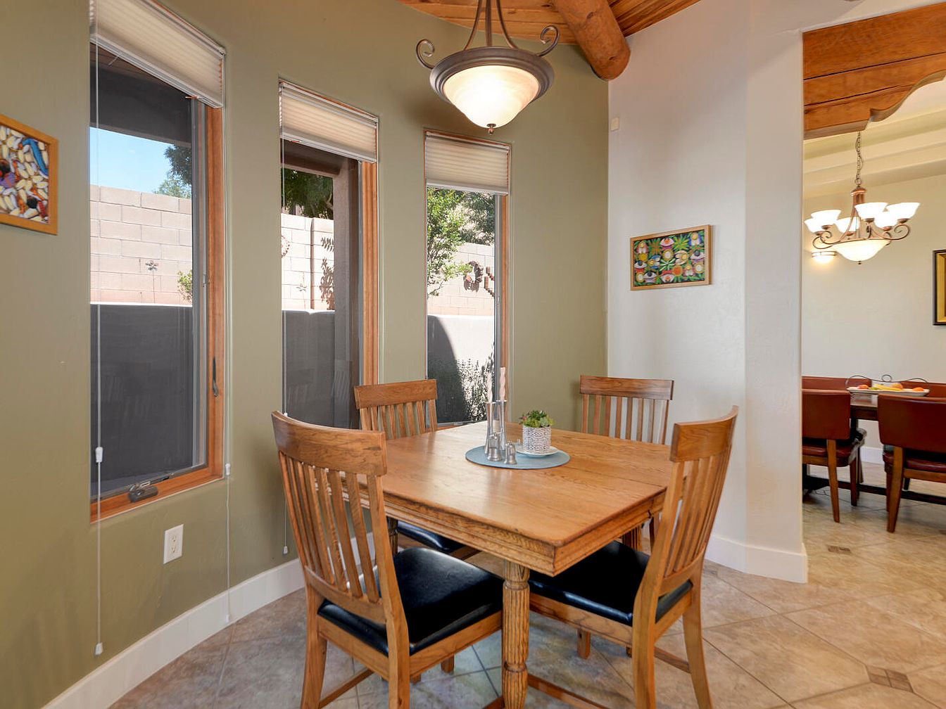 This inviting breakfast nook features a square wooden table surrounded by four matching chairs with cushioned black seats, blending comfort and natural warmth. Three tall, narrow windows framed in natural wood flood the space with light while offering a partial view of an outside brick wall and greenery. Walls are painted a soothing olive green that complements the earth tones of the tiled floor and wooden ceiling beams above. The soft, diffused overhead pendant light adds a cozy ambiance. Simple decorative elements, such as a small plant and salt and pepper set on a round placemat, enhance the welcoming, functional feel.