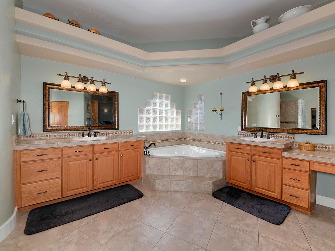 This spacious master bathroom features a dual-sink vanity setup with warm, natural wood cabinetry topped with light beige countertops. Each vanity is framed with large rectangular mirrors bordered in dark wood, illuminated by classic four-light wall sconces with frosted glass shades. Between the two vanities, a cozy corner soaking tub is nestled, enclosed by tiled walls and steps, offering practicality and comfort. Soft green walls and matching ceiling alcove bring a calming vibe, while glass block windows provide gentle natural light privacy. Plush black rugs add contrast and warmth to the beige tiled flooring, completing the elegant and functional design.