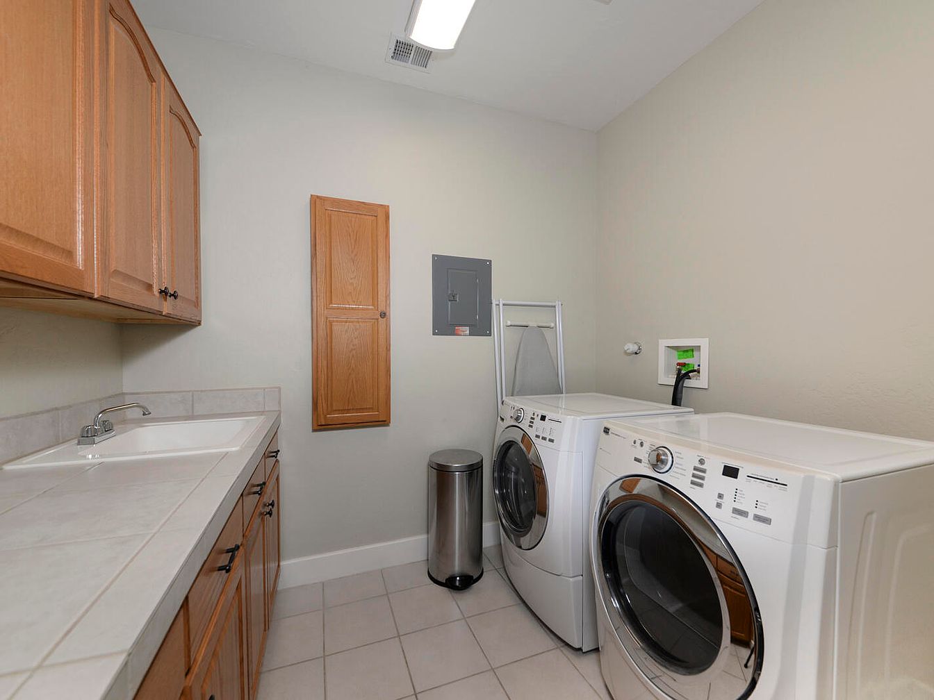 This laundry room is practical and straightforward, featuring a side-by-side front-loading washer and dryer in crisp white. The room is floodlit with clean white overhead lighting, emphasizing a neutral palette of beige walls and light gray floor tiles that add a subtle contrast. To the left, natural wood cabinets with classic paneling provide ample storage space, extending from base level to eye height. A countertop with a built-in utility sink offers convenient workspace for soaking or hand washing. Functional details include a wall-mounted ironing board, a stainless steel trash can, and accessible electrical panels, all contributing to a clean and organized utility space.