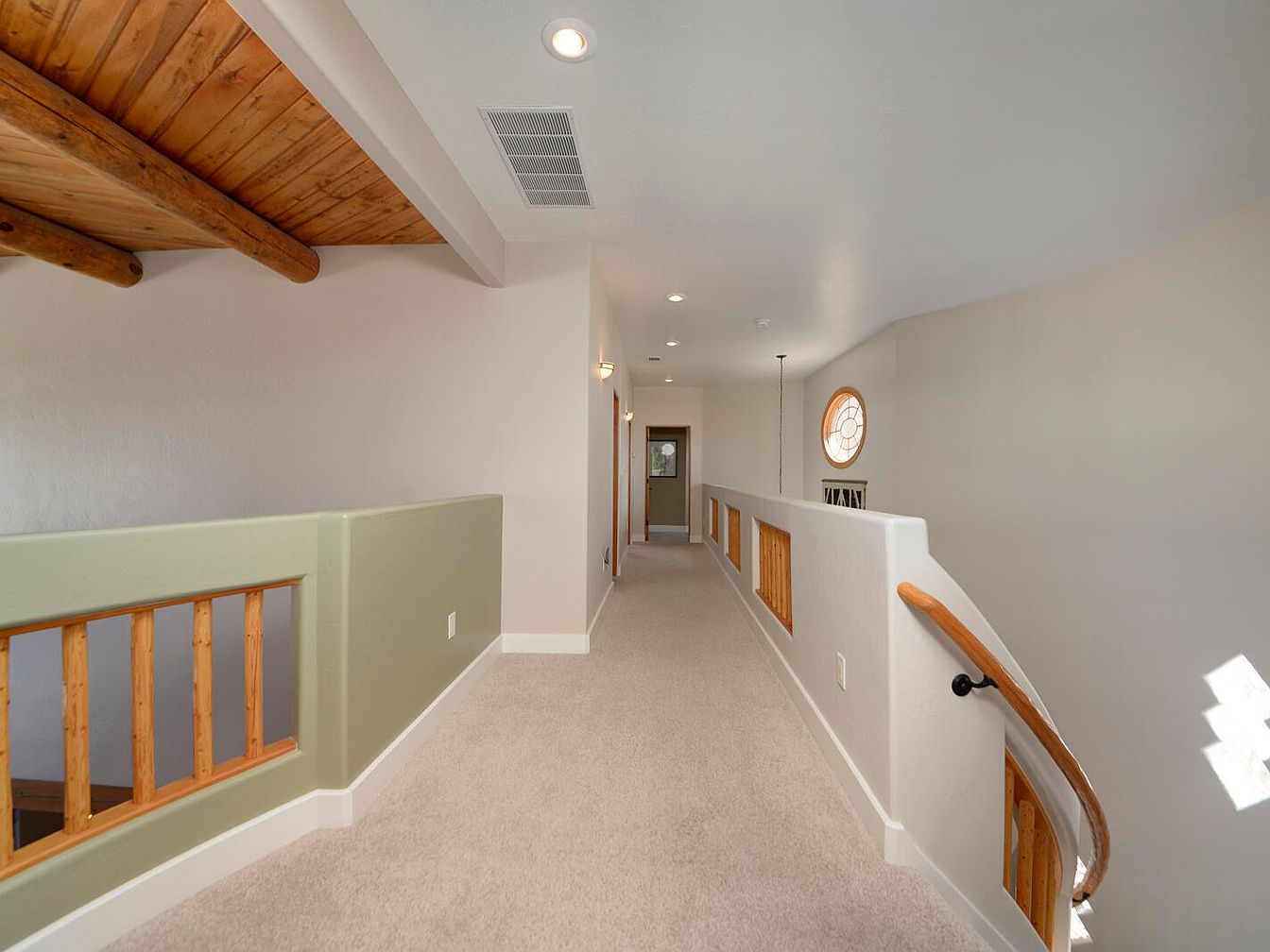 This upper hallway features a light and serene ambiance highlighted by neutral, soft beige carpeting that runs the full length. The walls are painted a light, warm white, contrasted by sage green half-walls with natural wooden spindles that create an open view to the stairway below. The ceiling showcases exposed wood beams, adding rustic charm, while recessed lighting and wall sconces provide soft illumination. At the far end, a round window with a decorative inner design invites natural light, further enhancing the combination of Southwestern aesthetic elements with a contemporary, clean finish.