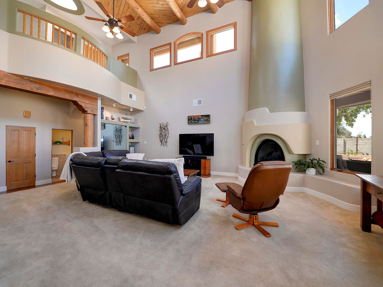 This inviting living room features a high vaulted ceiling with exposed wood beams and a ceiling fan, contributing to an airy, spacious feel. Neutral beige walls and carpeting create a warm base, contrasted by a large black sectional sofa and a cozy brown leather swivel chair with an ottoman, arranged around a central wood coffee table. A distinctive rounded fireplace with sculptural, Southwestern-style elements anchors the room, flanked by large windows that bring in natural light and outdoor views. The design combines rustic touches with modern comfort, creating an open, welcoming atmosphere enhanced by wooden architectural accents and built-in shelving.