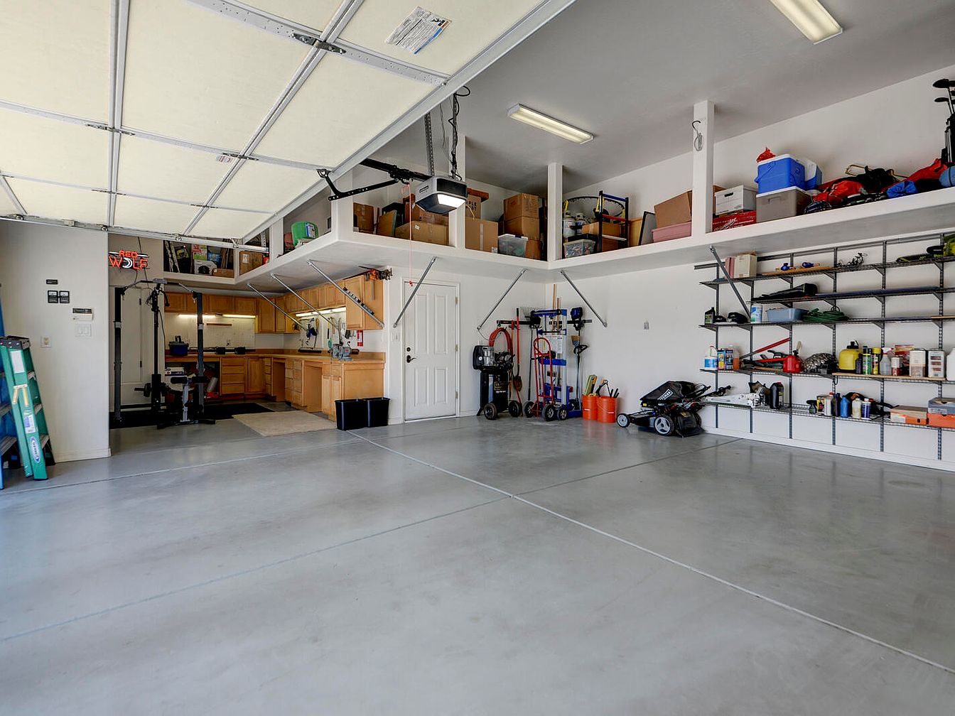 This spacious garage features a smooth concrete floor with ample open space for vehicle parking or larger projects. A well-lit area includes fluorescent fixtures overhead ensuring bright, functional lighting. Along the right wall, modular metal shelving holds various tools, cans, and equipment neatly arranged for practical access. Above, a raised loft runs along two walls, providing generous storage for boxes and bins, supported by sturdy metal braces. On the far side, light wood cabinetry and countertops create a functional workshop zone, complemented by organized hand tools and equipment on hooks and work surfaces. The overall design blends utility with order, showcasing an efficient and clean workspace.