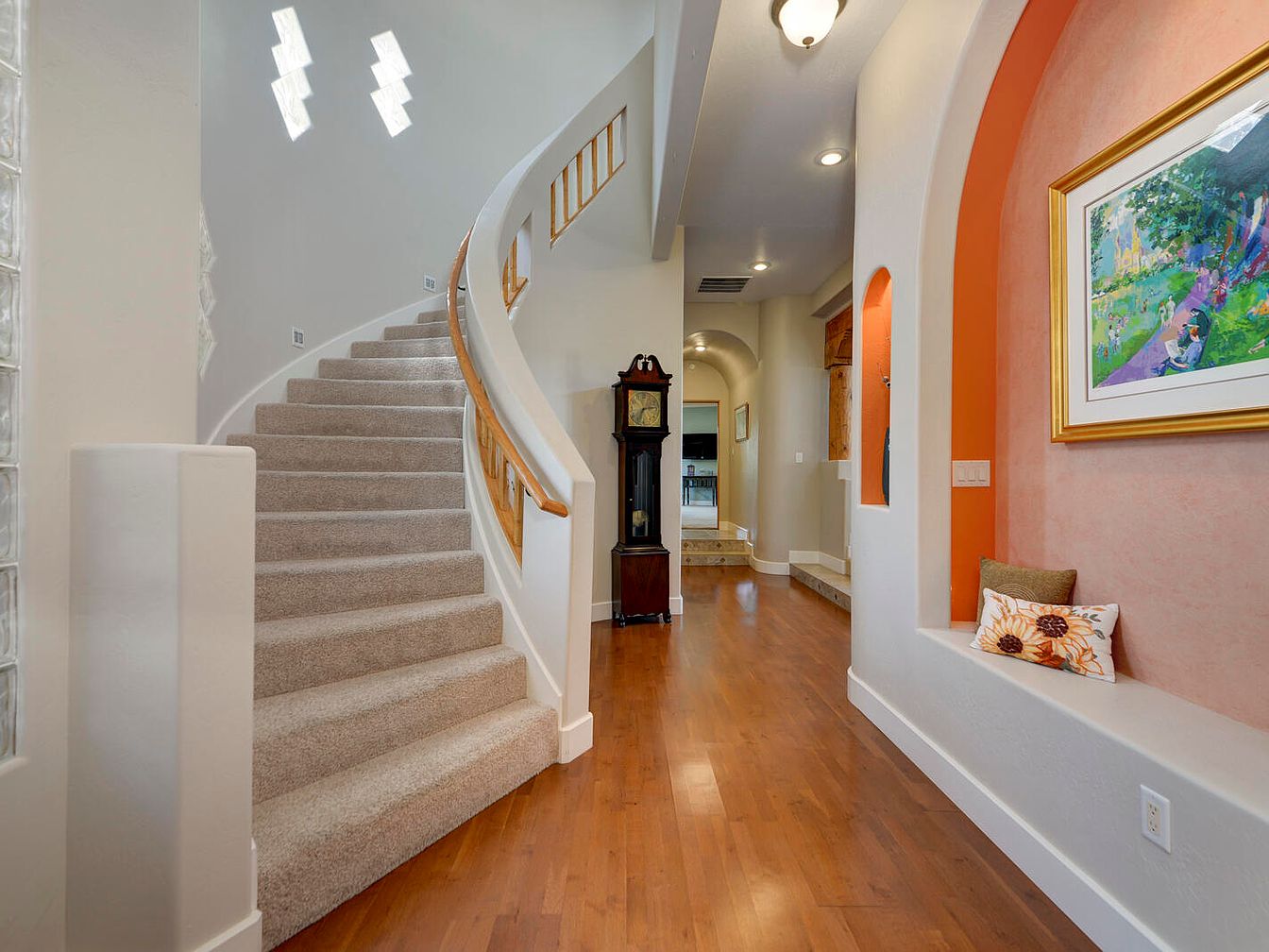 This inviting entryway features a gracefully curved staircase with plush beige carpeting and a white banister accented by natural wood handrails. The flooring is warm-toned hardwood, adding a cozy contrast to the light-colored walls. Along the hallway, arched niches incorporate pops of vibrant orange, one serving as a charming built-in bench adorned with decorative pillows and wall art. Recessed lighting highlights the hallway’s smooth plaster finish and emphasizes the architectural details, while a grandfather clock adds a touch of classic elegance near the staircase base. The space balances warmth and sophistication, creating a welcoming transition from entry to living areas.