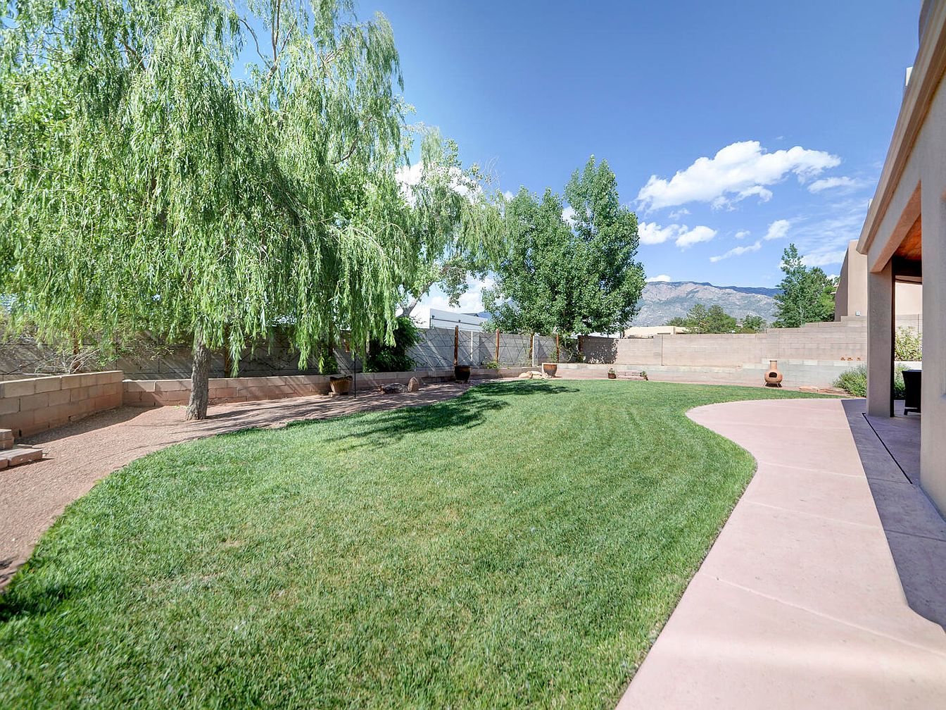 This spacious backyard features a well-maintained green lawn bordered by a smooth, light pink concrete walkway that curves gently alongside the home’s exterior wall. The yard is enclosed by a low, beige masonry block wall that provides privacy while blending naturally with the desert-like environment. Tall trees, including a leafy willow and other mature greenery, cast inviting shade over a gravel area beside the lawn. Potted plants and a clay chiminea add subtle warmth and charm. The blue sky and distant mountains create a serene, airy atmosphere that enhances the outdoor living space.