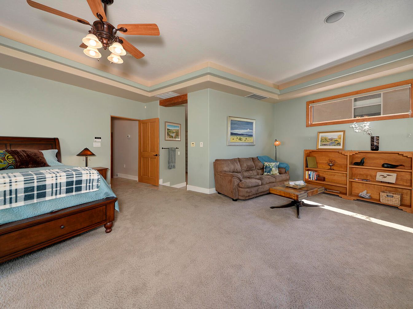 This spacious bedroom features a serene color palette with soft sage green walls complemented by warm wood accents in the door, bed frame, and built-in shelving. A cozy sitting area includes a plush brown loveseat and a wooden coffee table with metal legs, inviting relaxation. The carpeted floor adds warmth and comfort throughout the room. Architectural interest is provided by a tray ceiling with subtle two-tone paint and a ceiling fan with wooden blades and traditional light fixtures. Natural light filters in through a horizontal transom window above the shelves, highlighting decorative art and books neatly arranged on the wooden shelving unit.