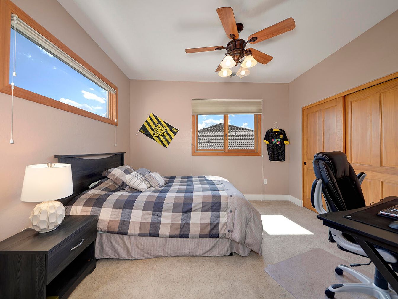 This bedroom features a neutral color palette with soft beige walls and white ceilings accented by medium wood trim. Twin windows on adjacent walls bring natural light, highlighting the cozy beige carpeting. A dark wood bed frame with matching nightstand hosts a geometric white lamp and a comfortable quad-patterned duvet in grey, navy, and white tones. A ceiling fan with wooden blades and glass light fixtures adds a classic touch. Against the far wall, wooden sliding closet doors add warmth, while a black ergonomic office chair and desk provide a functional workspace. Sports memorabilia on the walls gives a personal touch to this practical and inviting room.