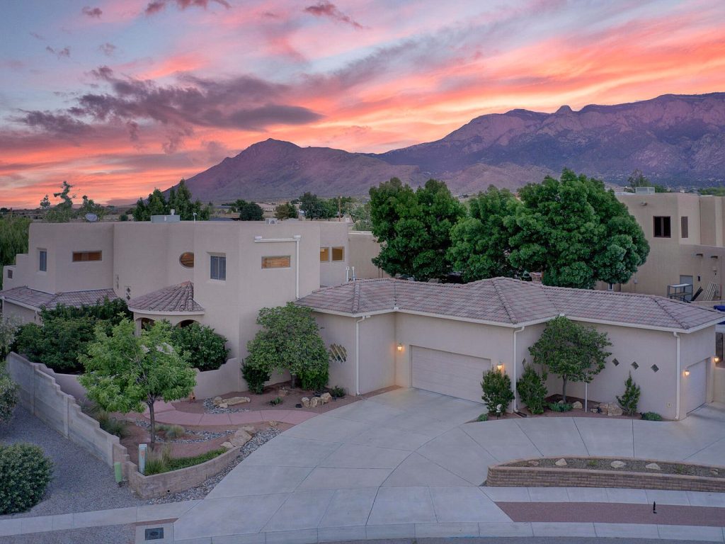 This stunning custom-designed home in Albuquerque, New Mexico, is a beautiful example of Southwestern architectural style with its smooth stucco exterior and flat rooflines, perfectly blending with the desert landscape. Situated on a generous 1/3 acre cul-de-sac lot, the property offers incredible mountain views that create a serene desert oasis atmosphere. The home spans 3,936 square feet and features versatile living spaces, including a gaming room with a wet bar that can be converted into an additional bedroom. Along with the downstairs office, this makes the home adaptable to 3 to 5 bedrooms total. Listed at $1,060,000, this exceptional property perfectly combines luxury, functionality, and picturesque surroundings.