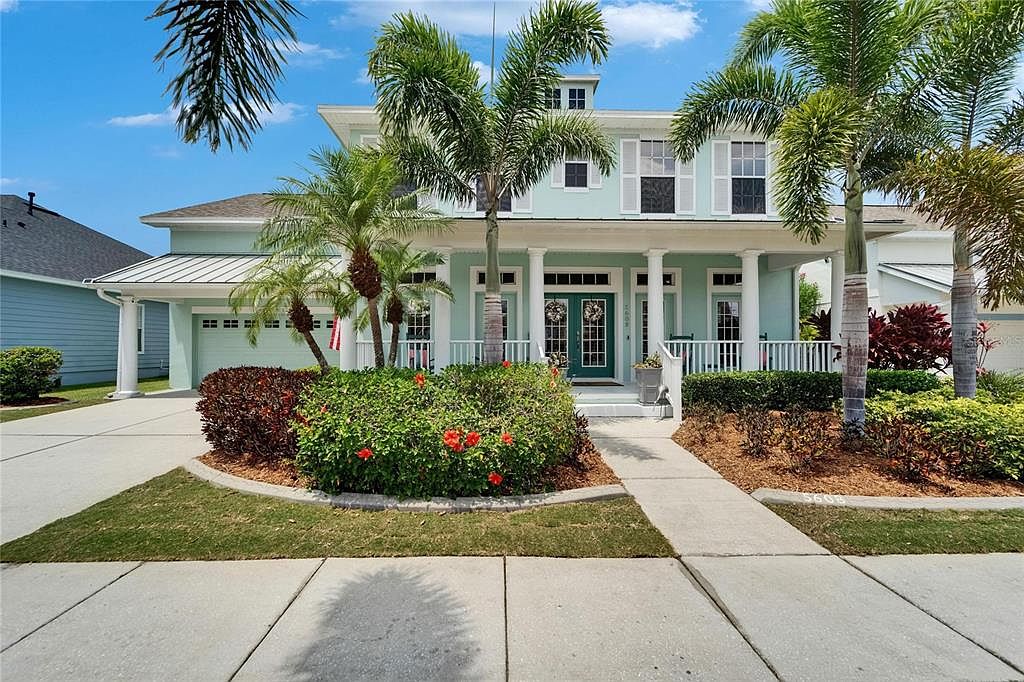 This stunning home at 5608 Skimmer Drive, Apollo Beach, FL, exemplifies the classic coastal architectural style blended with modern luxury. Built in 2004, this David Weekley Manatee floor plan has been fully remodeled and thoughtfully updated, offering over 3,500 square feet of living space. It features 4 bedrooms, 4 bathrooms, a spacious loft, formal office, and dining room, alongside a ground-floor primary suite for maximum convenience and comfort. Situated on a saltwater canal, the property boasts direct, no-bridge access to Tampa Bay, perfect for boating enthusiasts. The lot is beautifully landscaped with mature palms and a large covered front porch welcoming you home. Inside, dramatic 24-foot ceilings, custom built-ins, and hardwood floors throughout the main level create an inviting and bright atmosphere. The kitchen was completely remodeled in 2022 with quartz countertops, high-end appliances including a KitchenAid gas cooktop and GE Monogram ovens, and a large center island with seating. The primary suite on the first floor offers private access to the heated saltwater pool and spa area, featuring a standalone soaking tub and custom marble shower in the ensuite bathroom. Upstairs houses a secondary full suite, plus two additional bedrooms and a versatile loft space ideal for a game room, home theater, or gym. The home is a true smart home, equipped with app-controlled systems, Ring security, plantation shutters, and a fully renovated garage with epoxy flooring. Recent upgrades include a new roof (2020), two Trane AC units (2016), interior/exterior paint (2020), a new water softener (2023), and a seawall with a 10,000 lb boat lift. The outdoor living area features an outdoor kitchen with a Napoleon rotisserie grill and Big Green Egg smoker, surrounded by low-maintenance artificial turf. Residents have exclusive access to Mirabay Club amenities such as pools, fitness center, sports courts, parks, and private boat ramp. Offered at $1,335,000, this meticulously maintained and thoughtfully enhanced home is ready to provide unparalleled coastal living in Apollo Beach, FL.