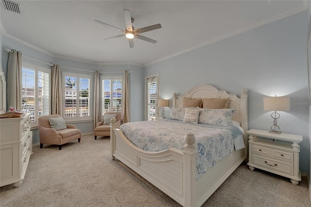 This master bedroom exudes calm with soft pastel blue walls complemented by warm beige carpeting that anchors the space. A large white wooden bed with a classic paneled headboard stands as the room’s centerpiece, dressed in serene bedding featuring light blue coral patterns and neutral-toned pillows. On either side, matching white nightstands hold modern lamps with circular metal accents. The room boasts ample natural light from three large windows fitted with white plantation shutters, flanked by elegant beige curtains. Two blush-toned armchairs provide a cozy sitting area, while a white dresser adds storage and balances the tranquil coastal-inspired design. A sleek ceiling fan overhead completes the airy ambiance.