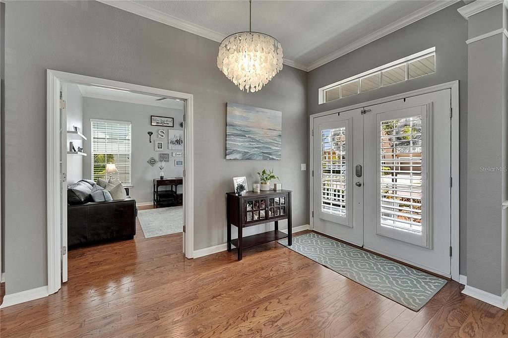 This welcoming entryway features warm hardwood floors that complement the soft gray walls, creating a calm and inviting atmosphere. The double front doors are adorned with white plantation shutters, allowing natural light to filter in while maintaining privacy. A patterned runner rug adds subtle texture and directs the pathway inward. An elegant chandelier overhead adds a touch of sophistication, balancing the contemporary feel. A small dark wood console table against the wall beneath a tranquil seascape painting offers a spot for decorative accents and keys. The open doorway leads to a cozy adjacent living area, visible with comfortable seating and soft natural light.