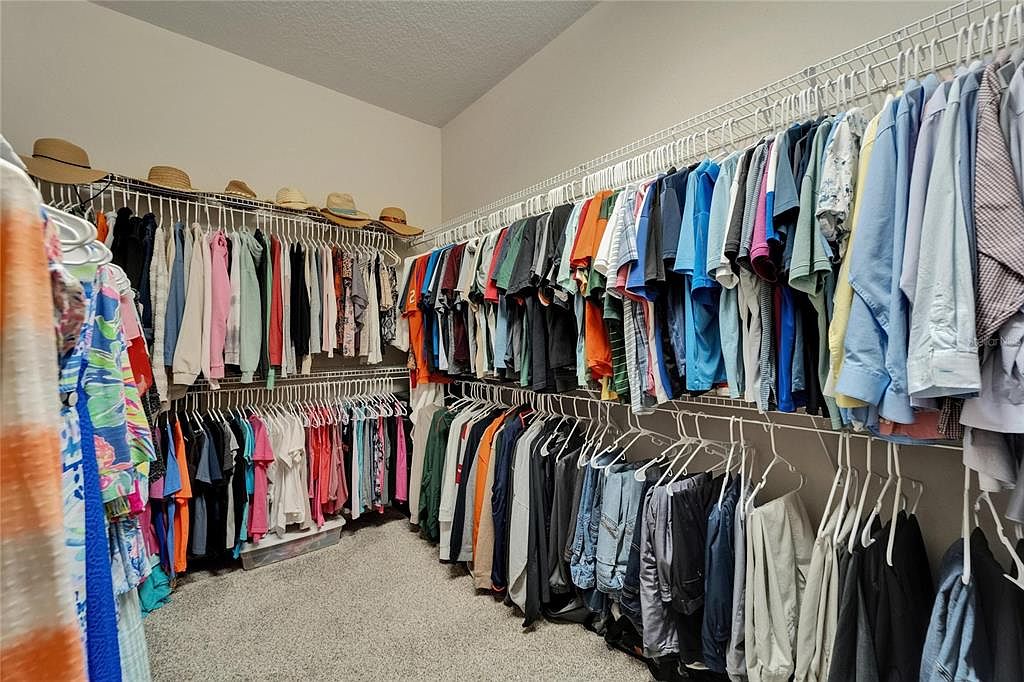 This spacious walk-in closet features an efficient double-tiered wire shelving system wrapping around two walls. The upper racks are filled with a wide range of colorful shirts and hats, while the lower racks neatly display pants and shirts, maximizing storage in an organized manner. The walls are painted a soft neutral color, allowing the vibrant clothing hues to stand out. The floor is carpeted in a light tone, adding warmth underfoot. The closet’s design emphasizes functionality and easy access, catering to a household with varied wardrobe needs while maintaining a tidy appearance.